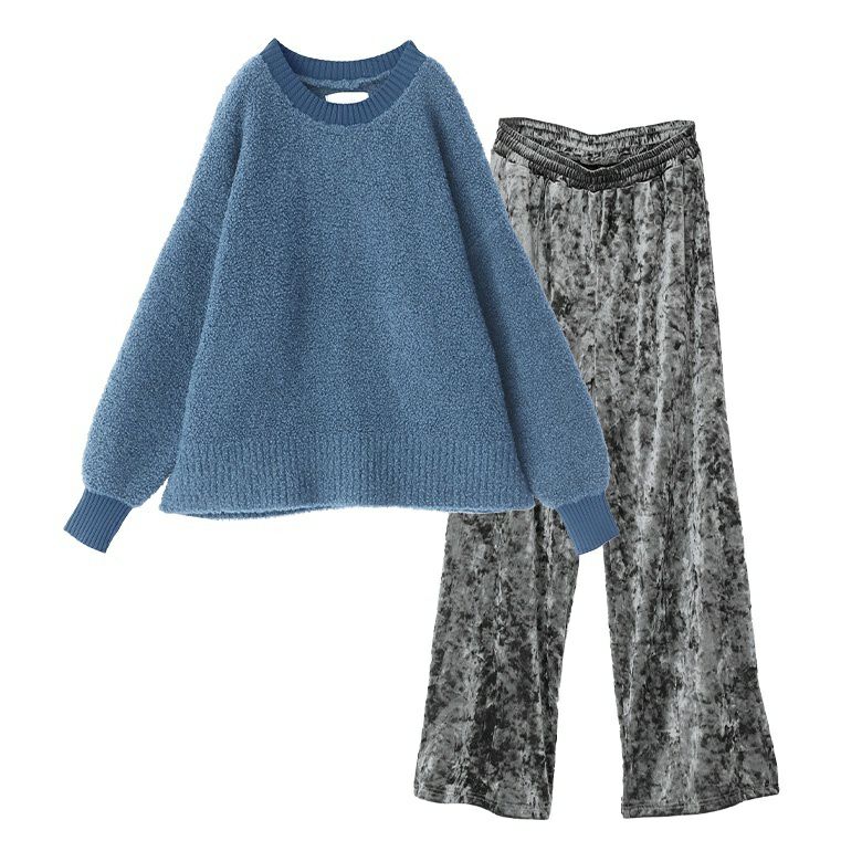 『配色ブークレニットプルオーバー×クラッシュベロアワイドパンツコーデ2点SET』