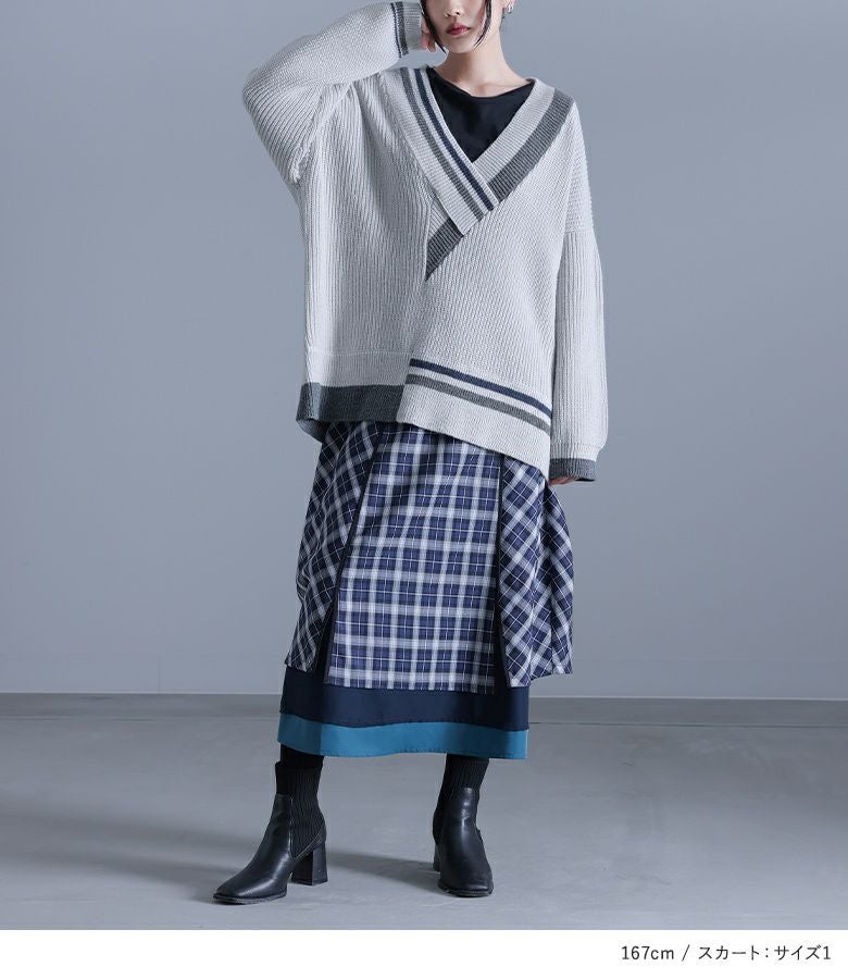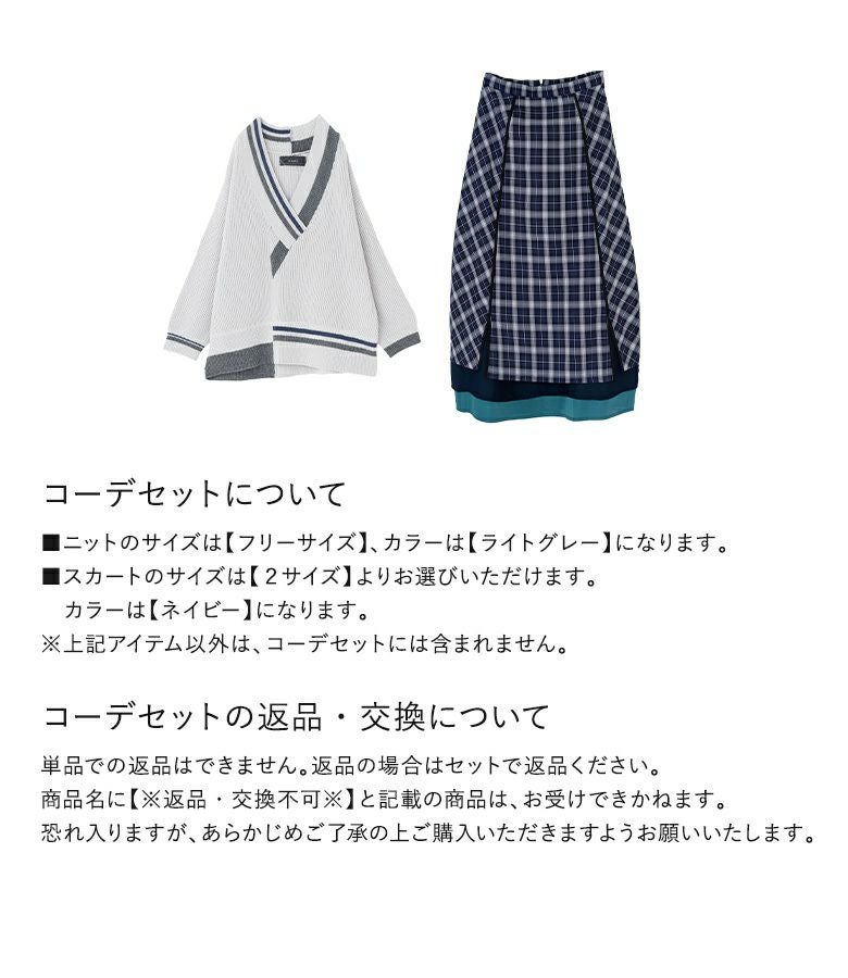 『アシメ衿デザインニット×異素材切替コクーンチェックスカートコーデ2点SET』