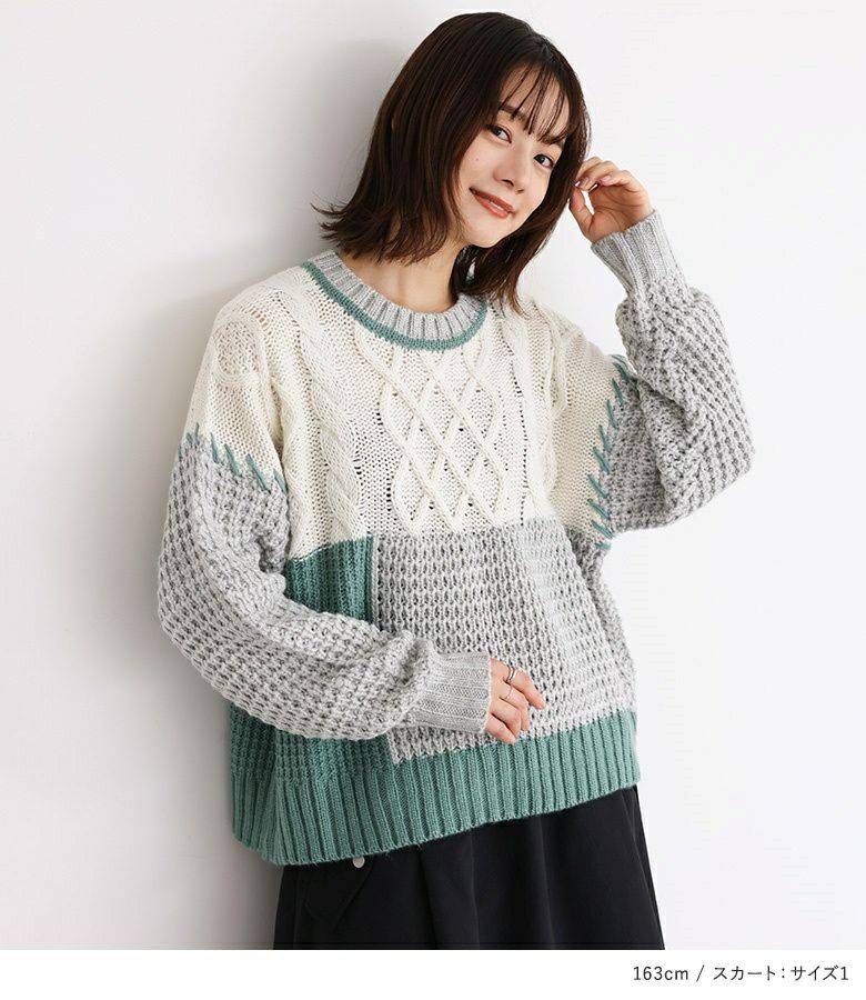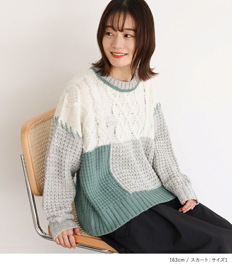 4. 【送料無料】『配色パッチワークケーブルニット×ナイロン裏フリースフレアスカートコーデ2点SET』【メール便不可】【50】