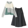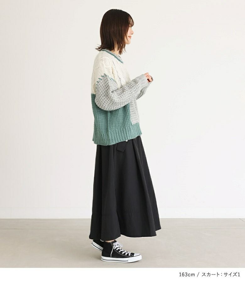 『配色パッチワークケーブルニット×ナイロン裏フリースフレアスカートコーデ2点SET』