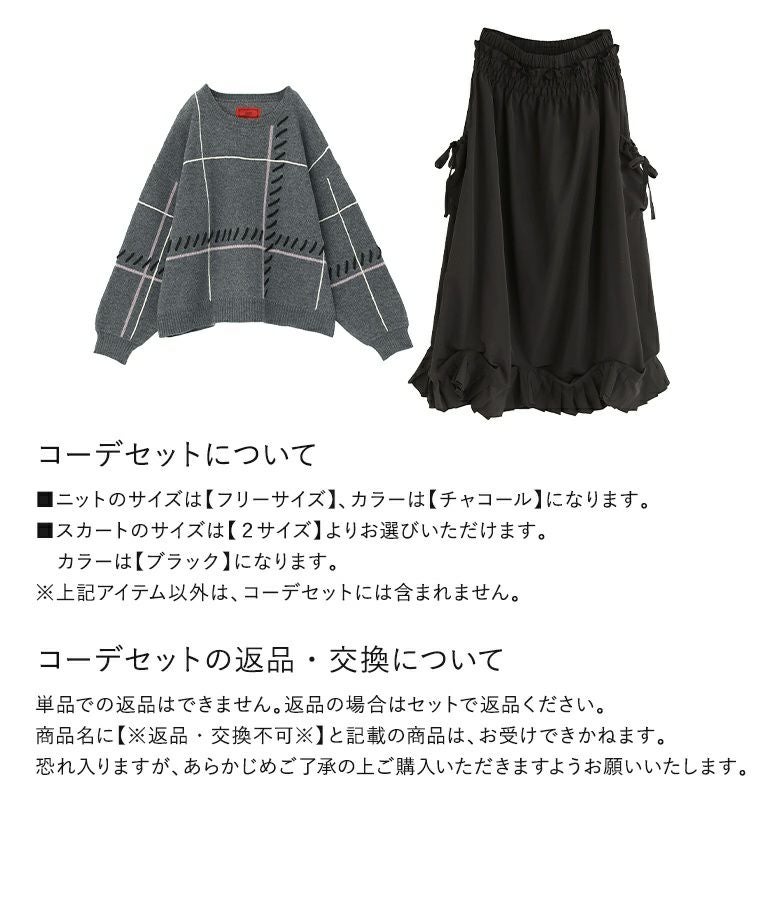 『ジャカードチェックニットプルオーバー×ランダムヘムナイロンライクスカートコーデ2点SET』