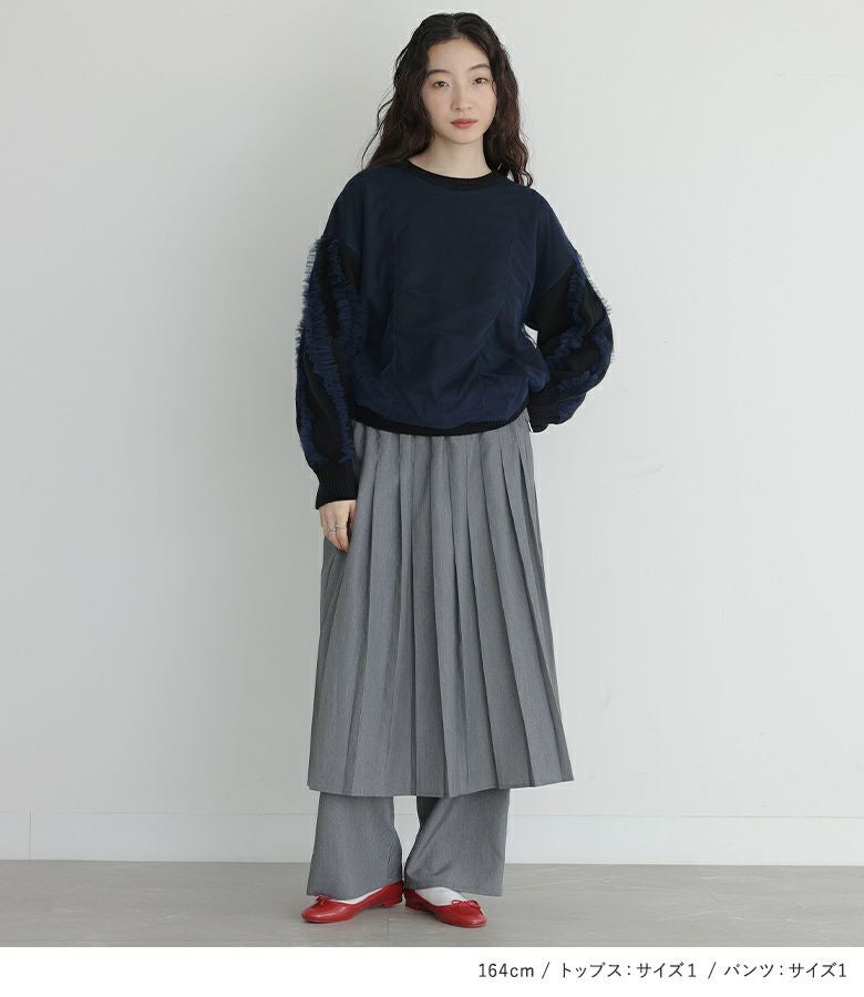 『チュールレイヤーニット×プリーツスカート×ストレートパンツセットコーデ2点SET』