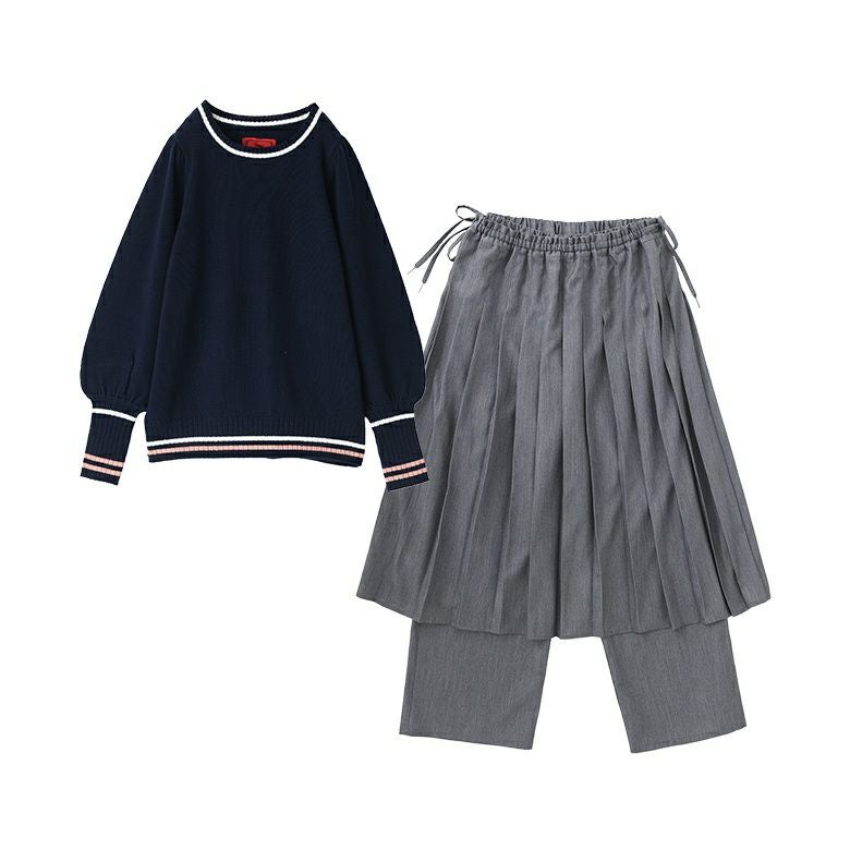 『配色ラインパフスリーブニット×プリーツスカート×ストレートパンツセットコーデ2点SET』