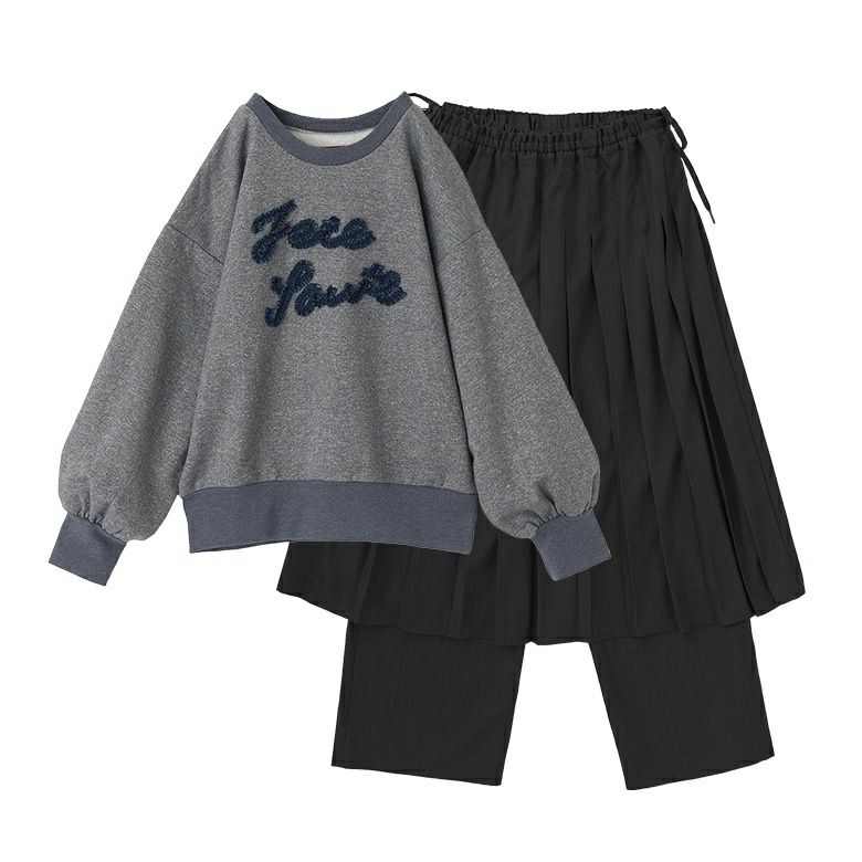 『チュールロゴラメスウェット×プリーツスカート×ストレートパンツセットコーデ2点SET』