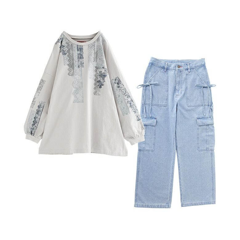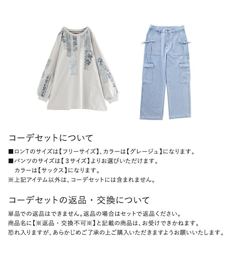 他の画像を見る 送料無料★届いてすぐにお洒落に変身2点コーデSET♪ 【送料無料】『レースプリントロンT×リボン付きデニムペインターパンツコーデ2点SET』【メール便不可】【40】 ¥ 12,960 税込 (0)