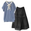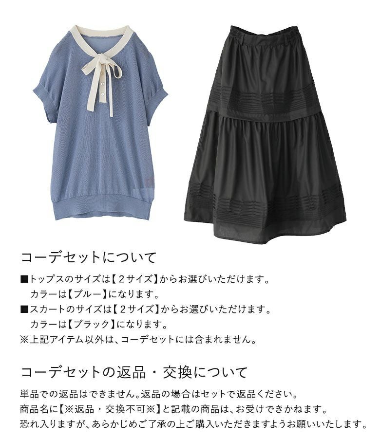 『ボウタイ配色サマーニットトップス×ピンタックフレアスカートコーデ2点SET』