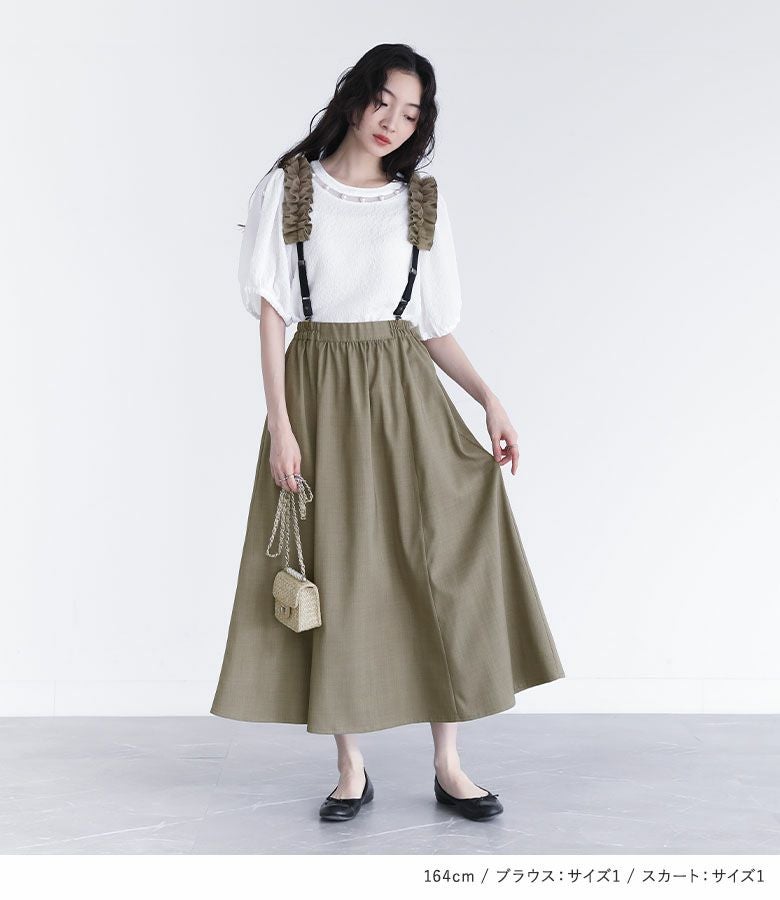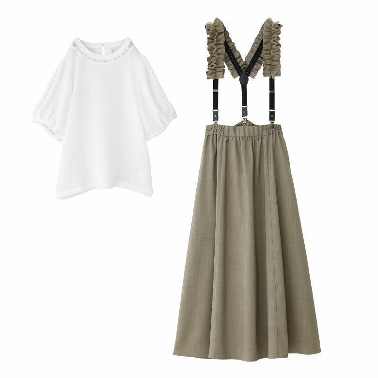 『フェイクパール付きフラワージャカードブラウス×フリルサスペンダー付きフレアスカートコーデ2点SET』