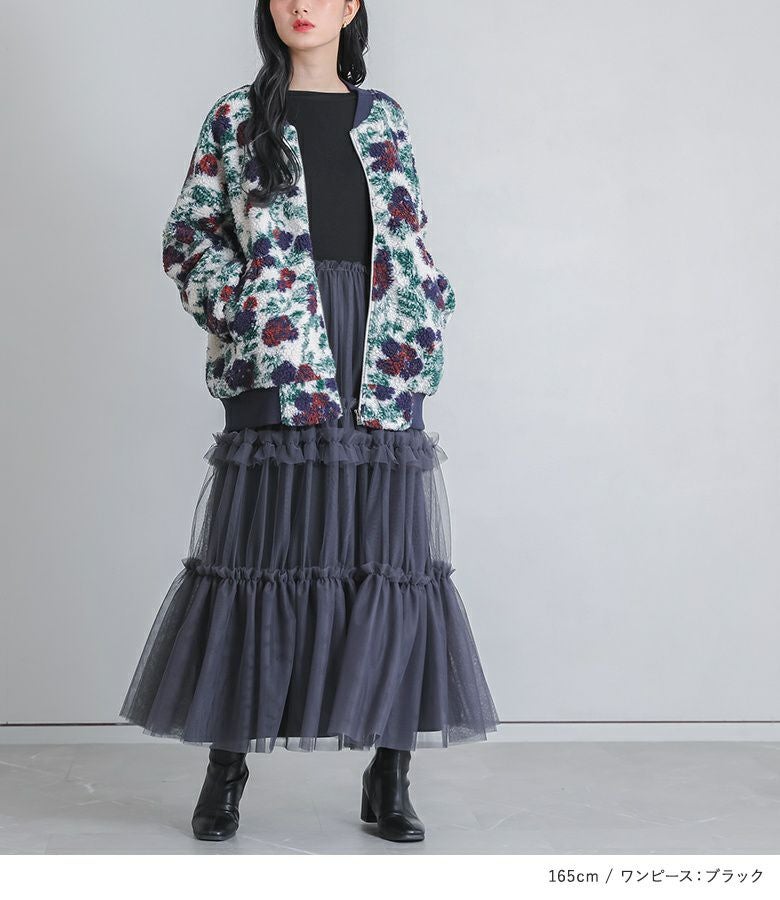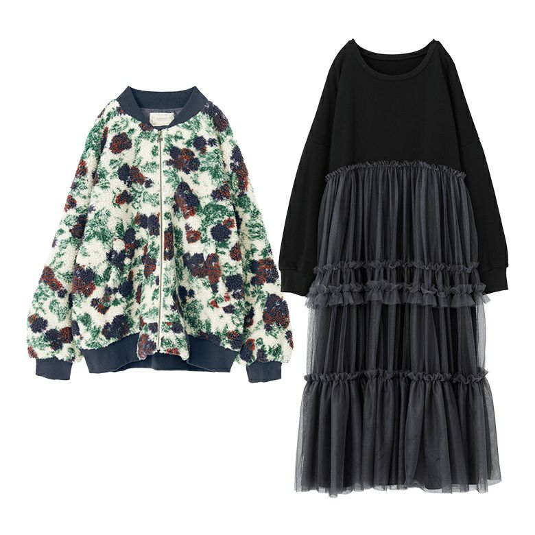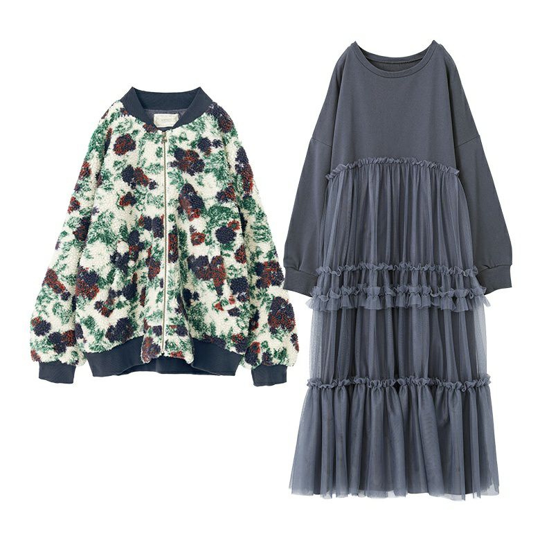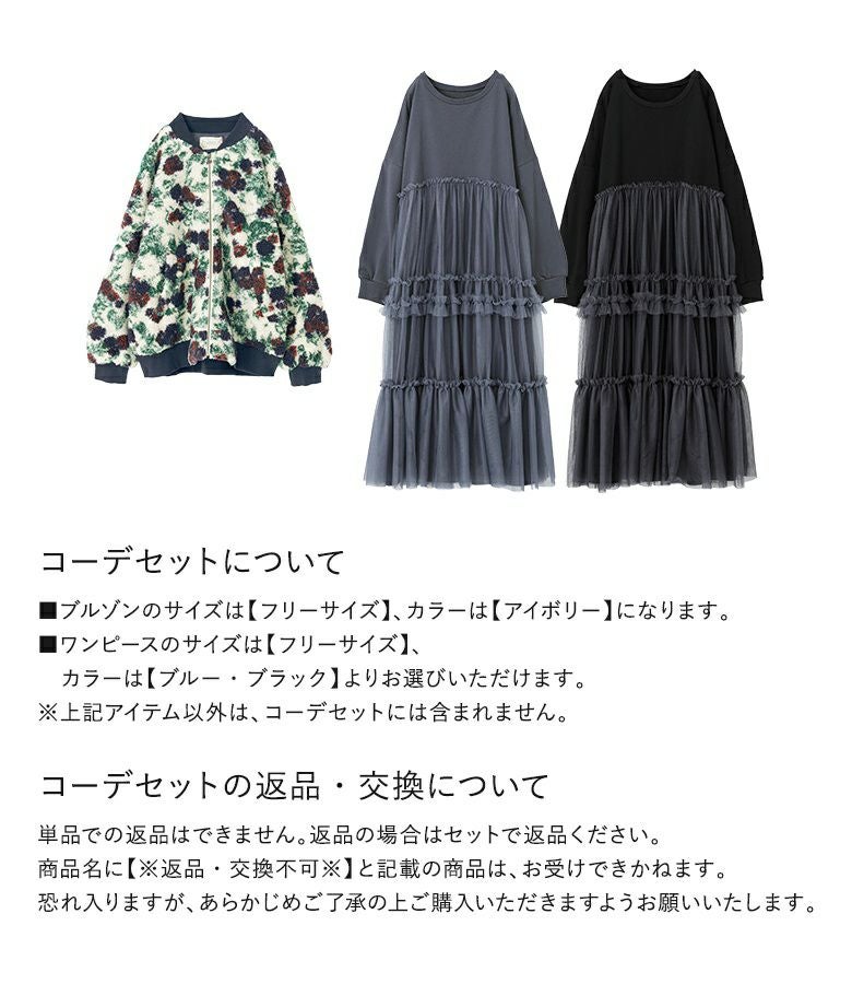 『花柄ボアブルゾン×チュールドッキングスウェットワンピースコーデ2点SET』