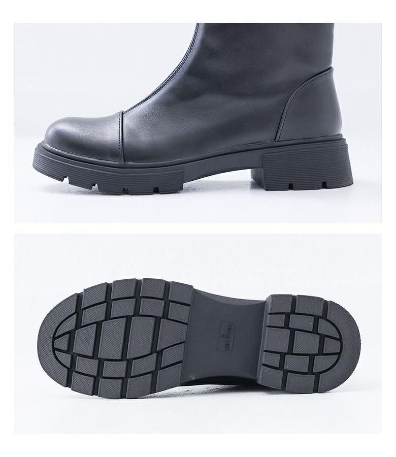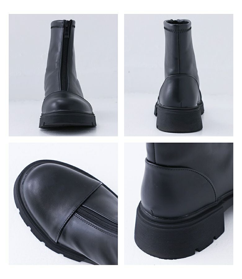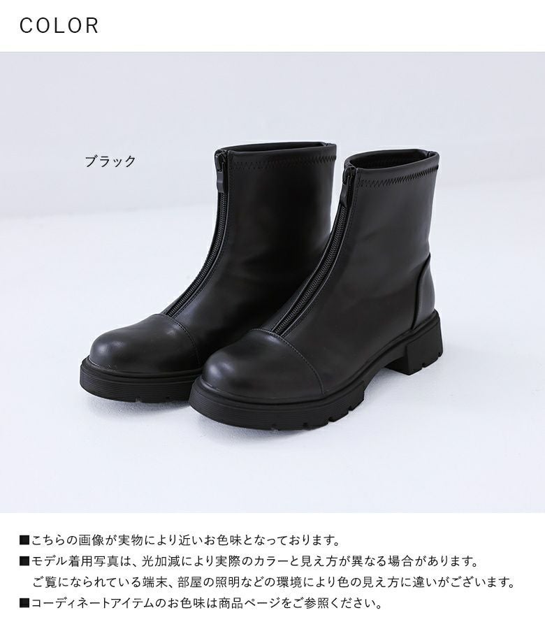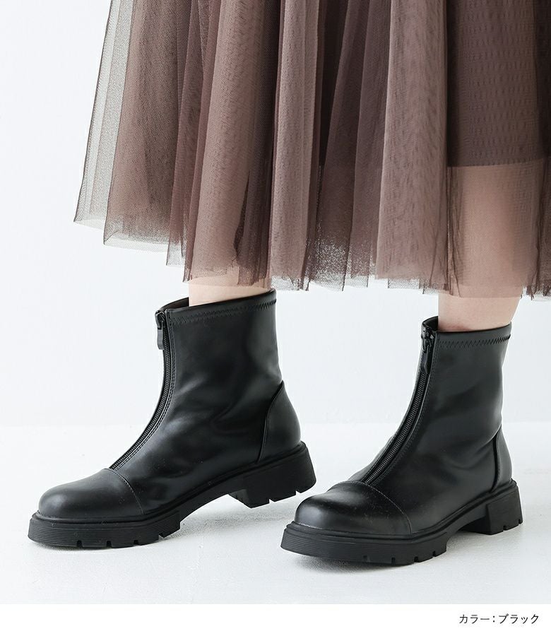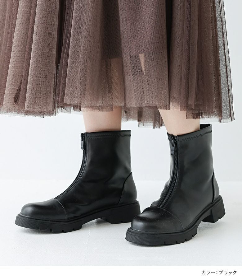 ジップデザインのショートブーツ。フロントジップで脱ぎ履きがしやすいデザインです。程よい高さがありながらも軽い厚底ソールで、疲れにくく歩きやすい仕様です。