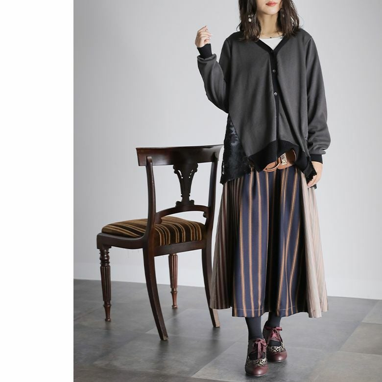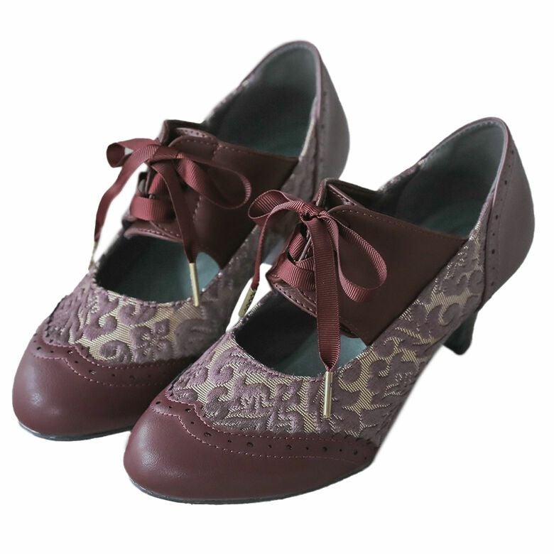 そして、ダマスク柄のふくれジャカード生地×PUレザーの異素材デザイン、グログランリボンで編み上げたアグレット付きのリボンが、レトロな雰囲気を放ちます。