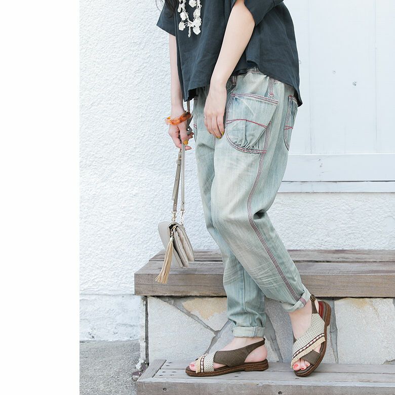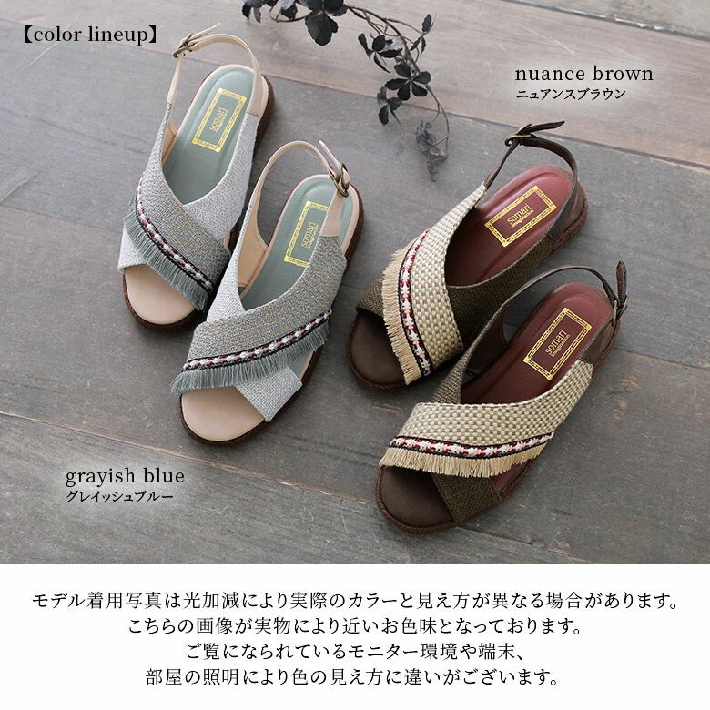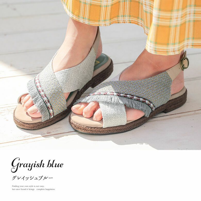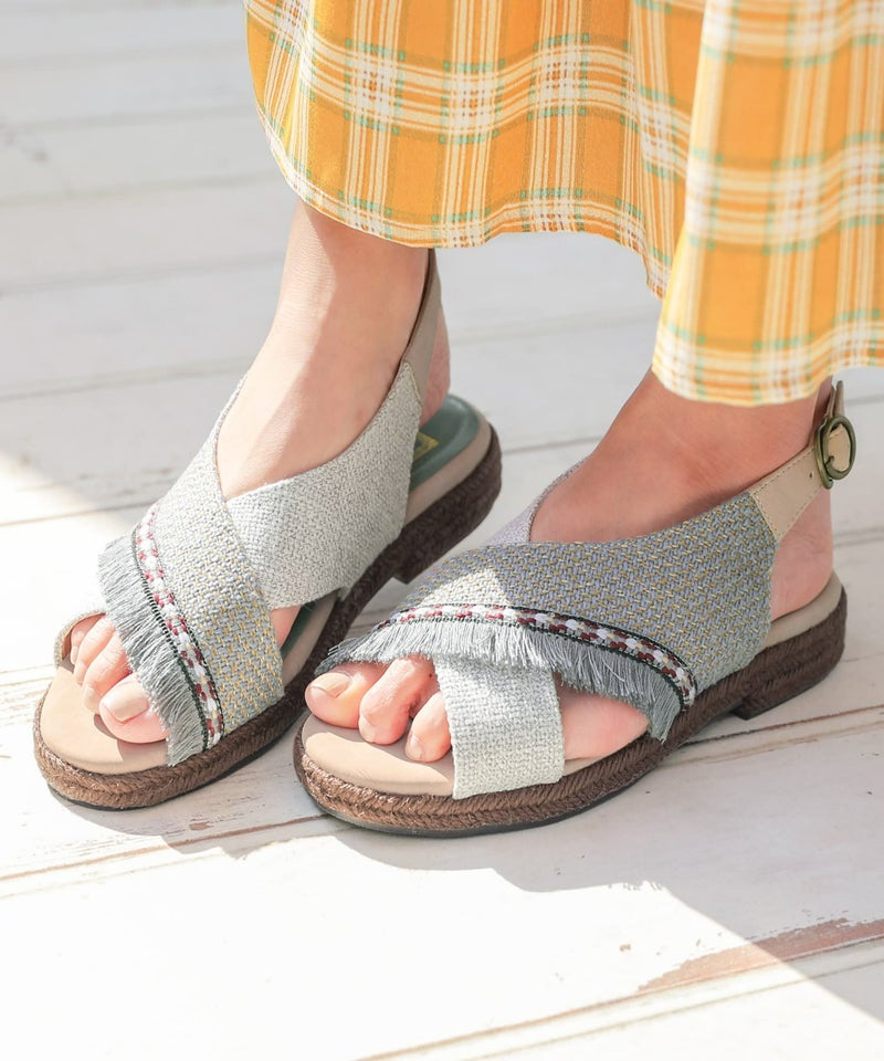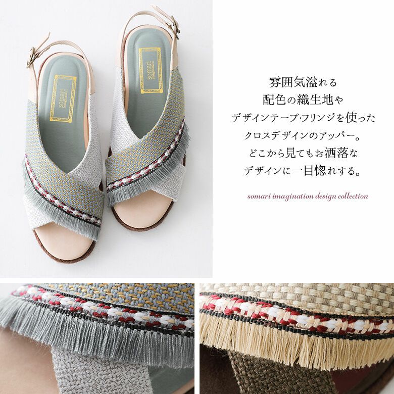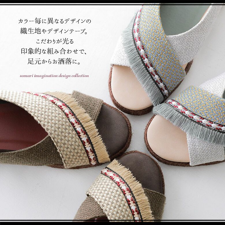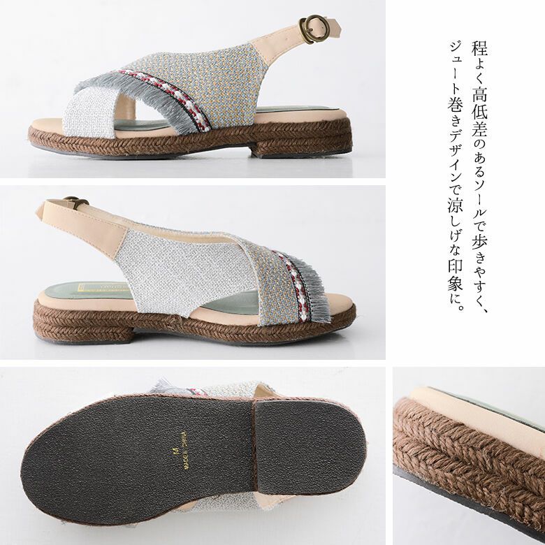 雰囲気溢れる織生地やデザインテープ・フリンジをあしらったクロスデザインのアッパーに、ソールはジュート巻きで涼しげな印象に仕上げました。