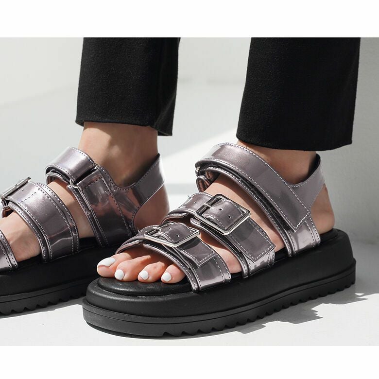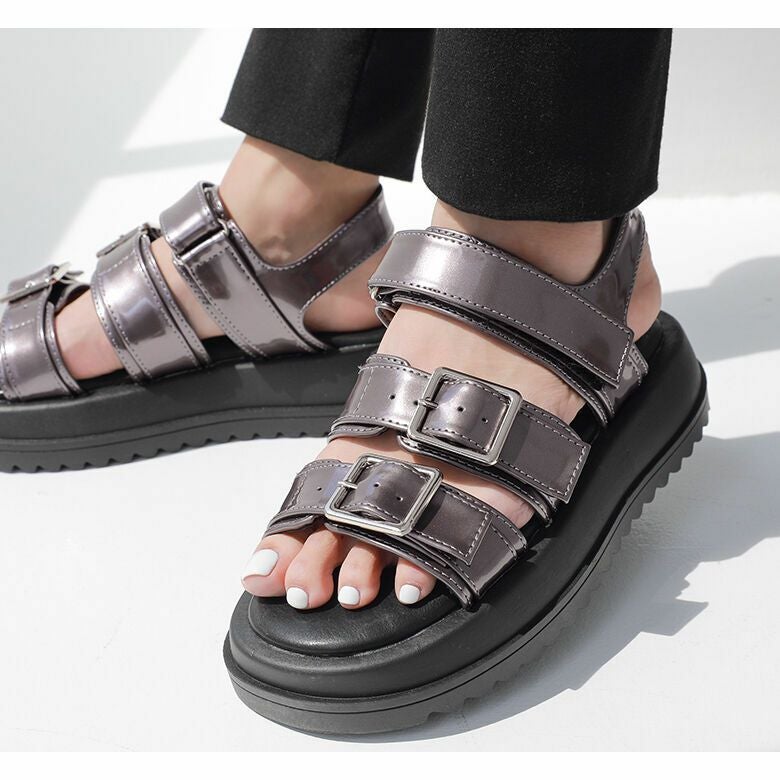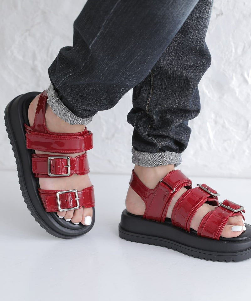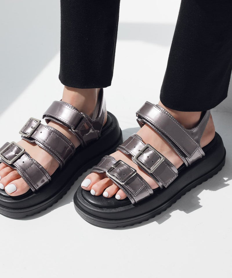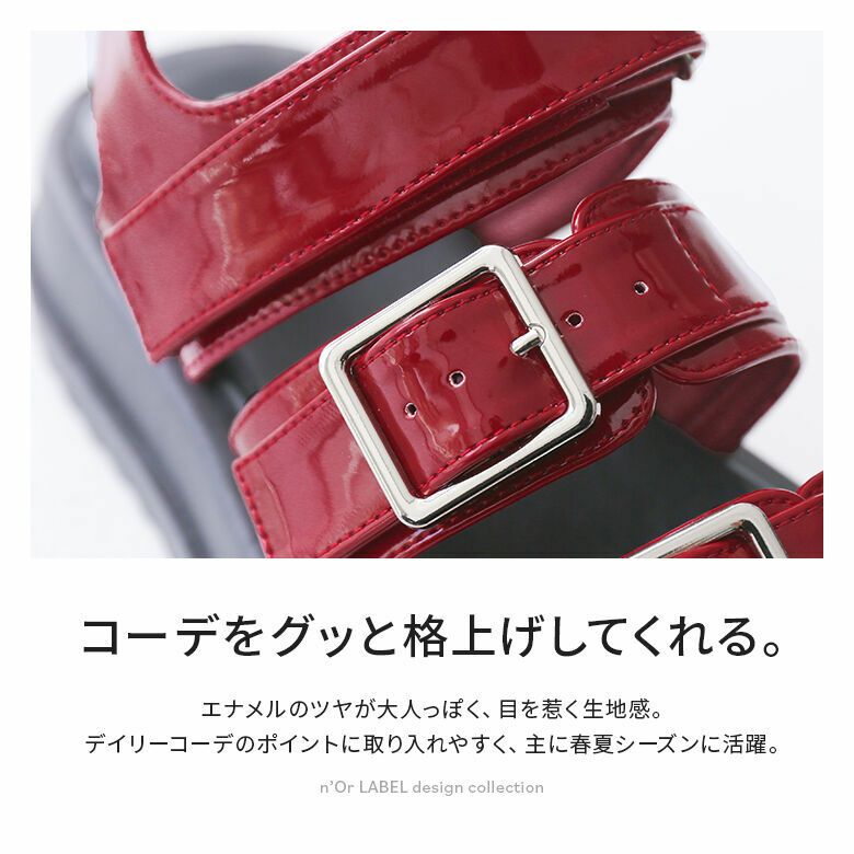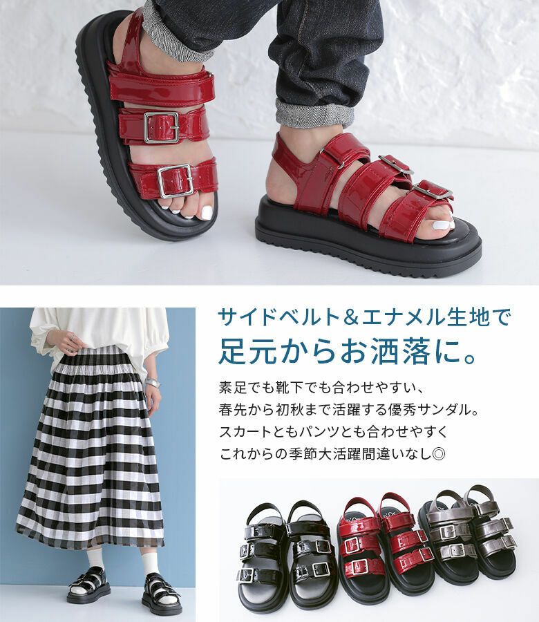 エナメルのツヤが大人っぽく、目を惹く素材感。デイリーコーデのポイントに取り入れやすく、スカートともパンツとも合わせやすい優秀サンダルです。