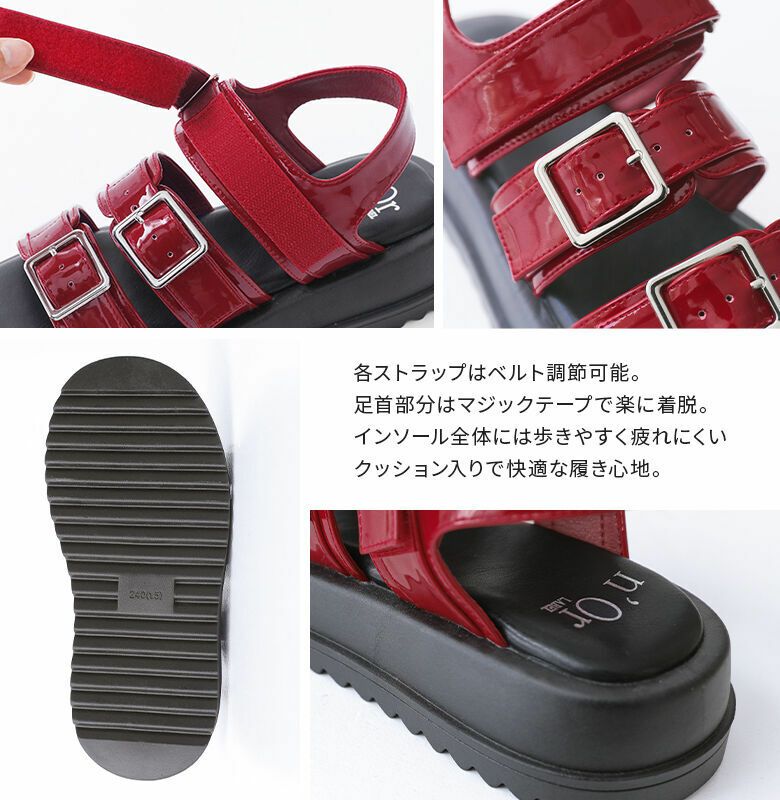 各ストラップはベルトで調節可能、足首部分はマジックテープで楽に着脱できるのが嬉しいポイント。インソール全体には歩きやすく疲れにくいクッション入りで、快適な履き心地を叶えます。