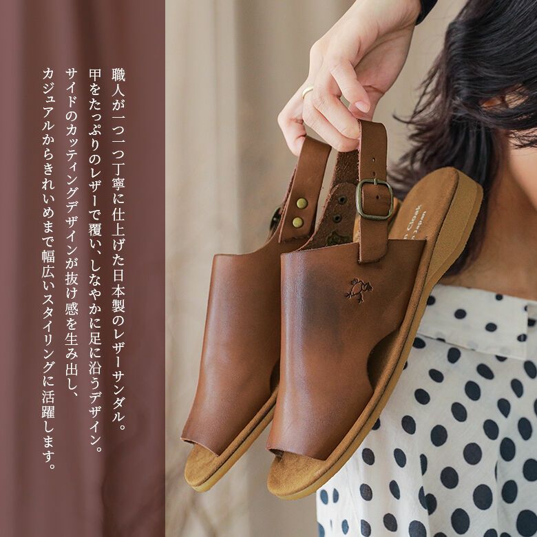 職人が一つ一つ丁寧に仕上げた日本製のレザーサンダル。甲をたっぷりのレザーで覆い、しなやかに足に沿うデザイン。サイドのカッティングデザインが抜け感を生み出し、カジュアルからきれいめまで幅広いスタイリングに活躍します。