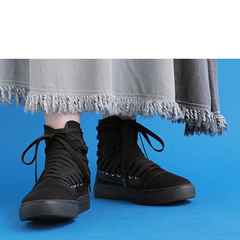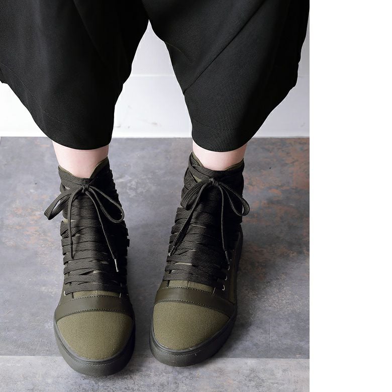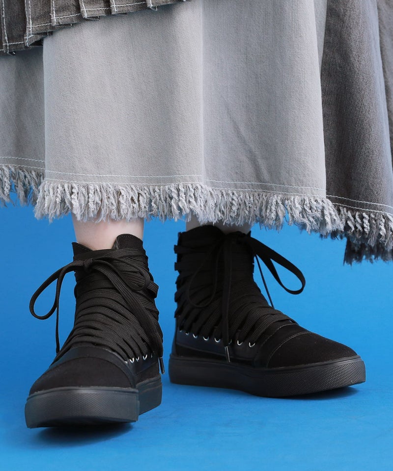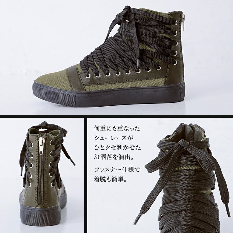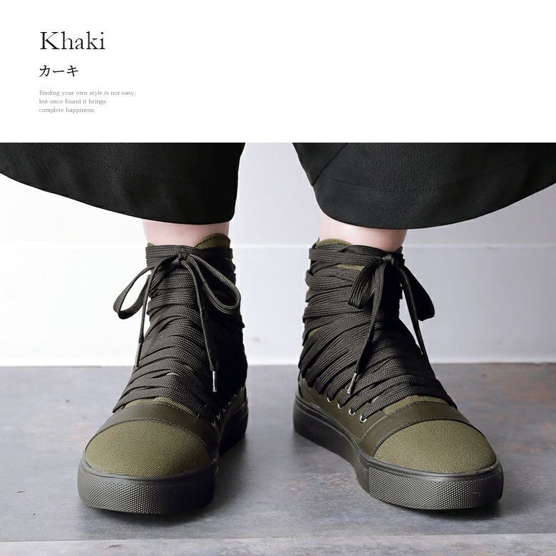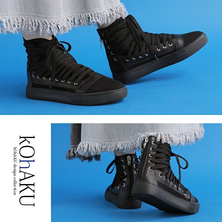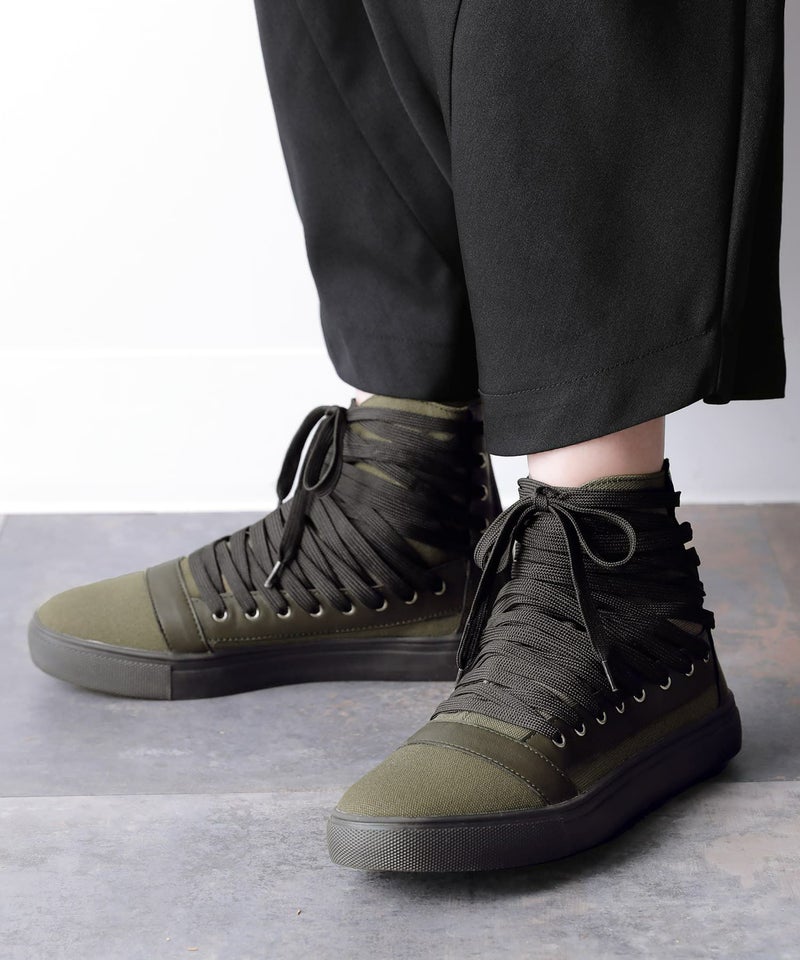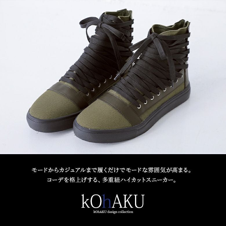 足元から洗練されたMODEスタイルを確立する≪kOhAKU≫多重紐デザインハイカットスニーカーです。