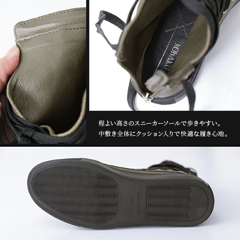 程よい高さのスニーカーソールで歩きやすく、中敷き全体にクッションが入っているから快適な履き心地を実現。バックファスナー仕様で着脱も楽々です。