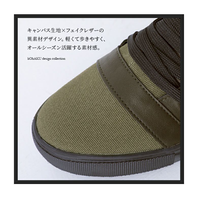 キャンバス生地×フェイクレザーの異素材デザインで、オールシーズン活躍する素材感です。