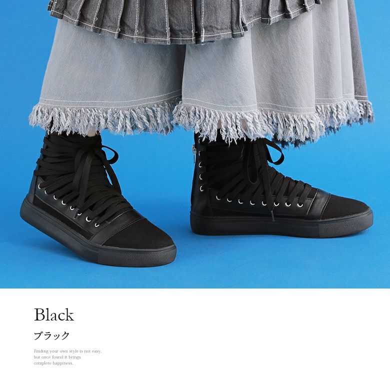 何重にも重なったシューレースがひとクセ利かせたお洒落を演出。周りの目を惹く存在感を放ち、モードからカジュアルまでいつものスタイルを格上げします。