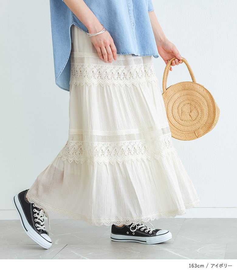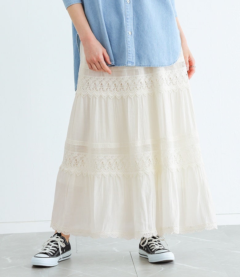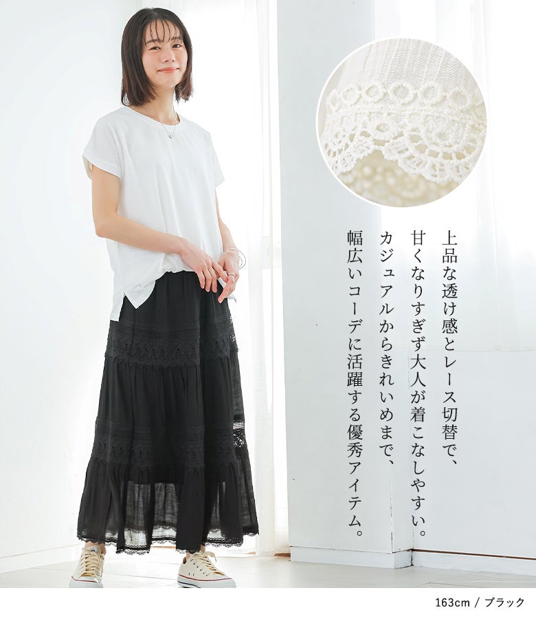 カジュアルからきれいめまで活躍するレース切替フレアスカート。