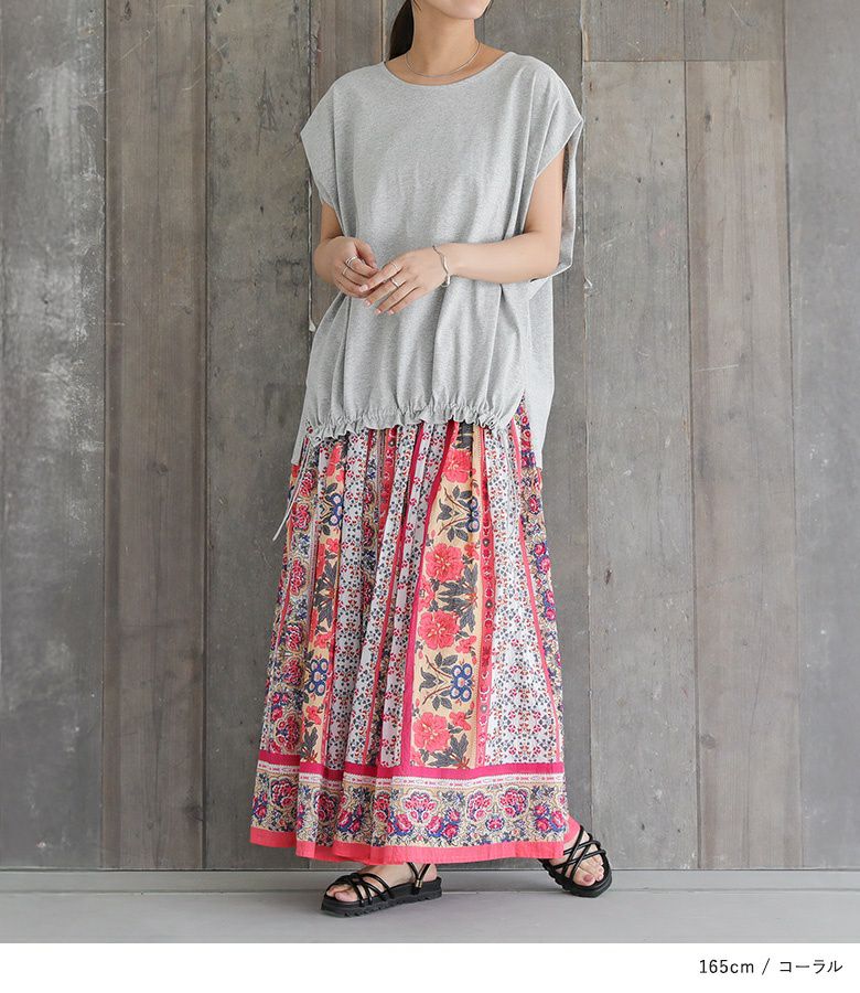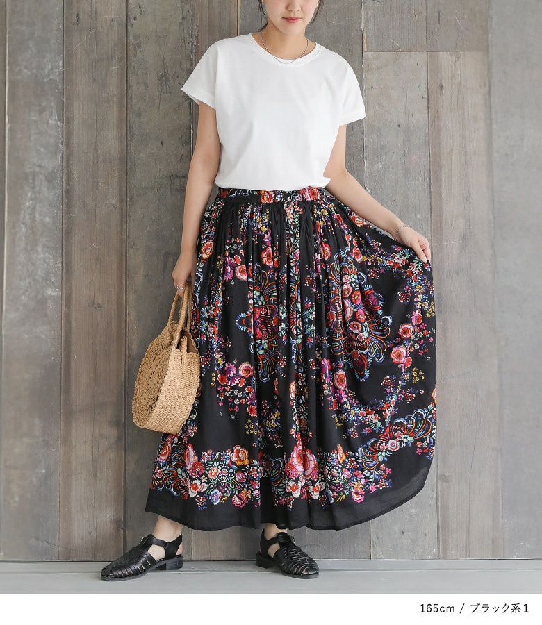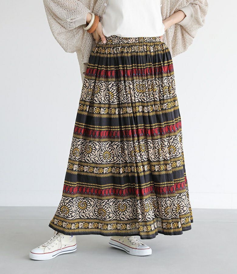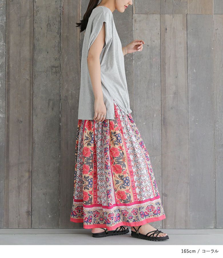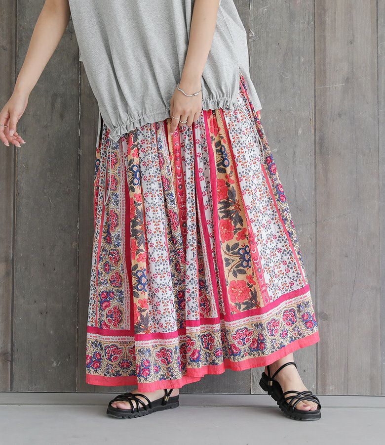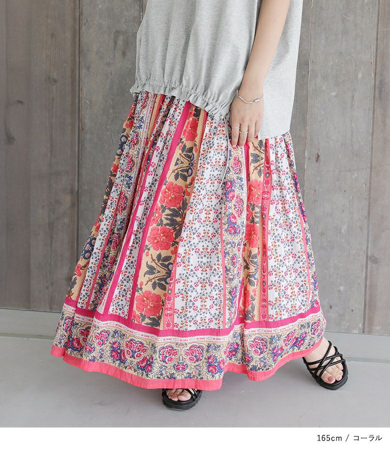 コットンの風合いと花柄が目を惹く、インドコットンマキシスカート。
