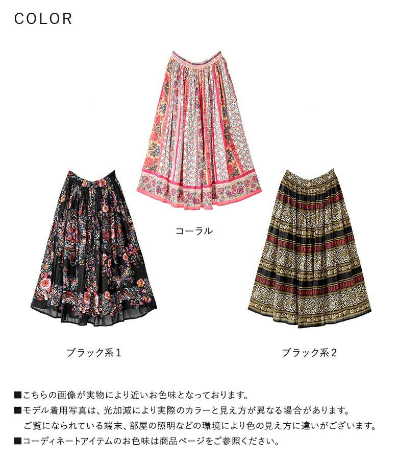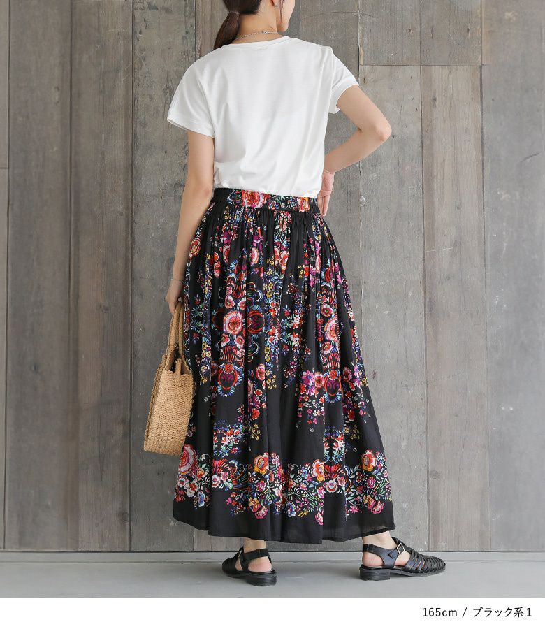 ブラック系1を購入。一目惚れして、再入荷を待っての購入でした!黒地に鮮やかな花柄が映えて、本当に素敵なスカートです❤コットンなので、マキシ丈でも軽く、風に揺れて、なおさら素敵です❤