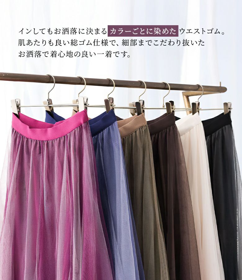 チュールの透け感を楽しみながら、寒い季節も暖かく着用できるロングスカート。