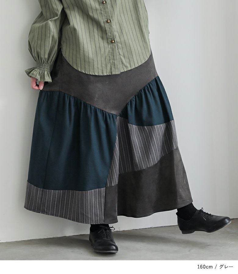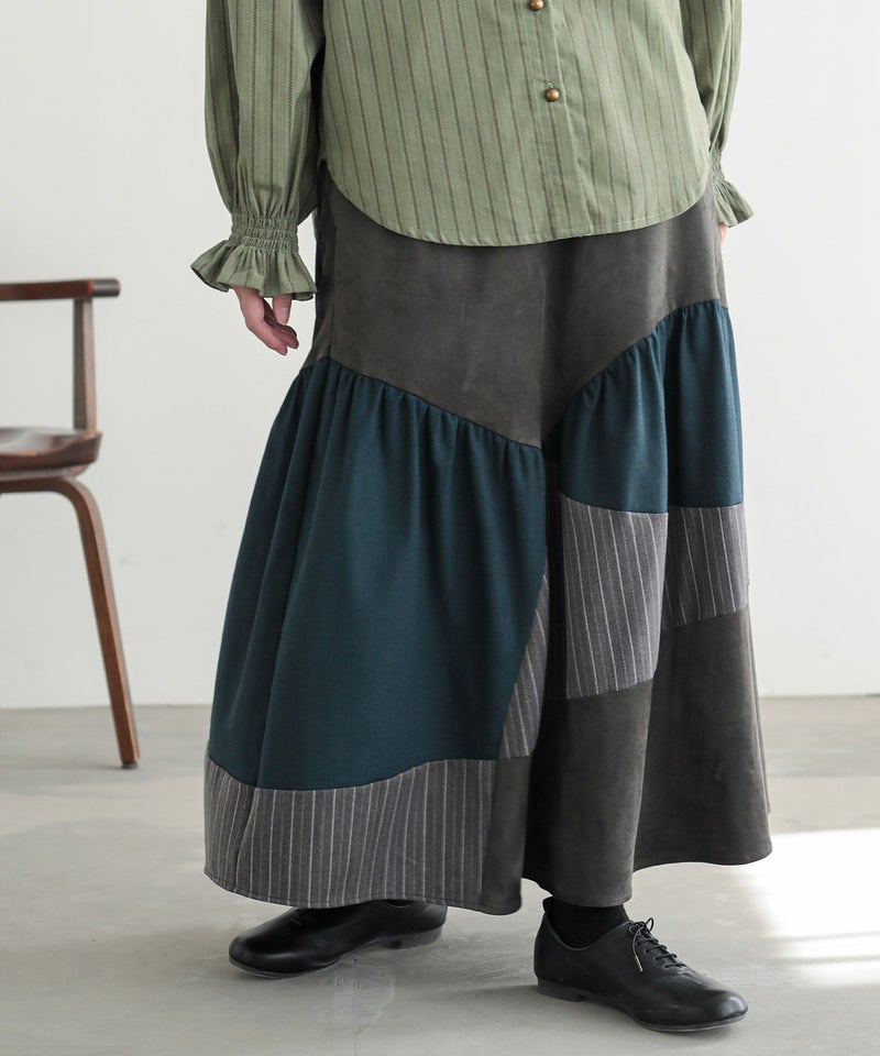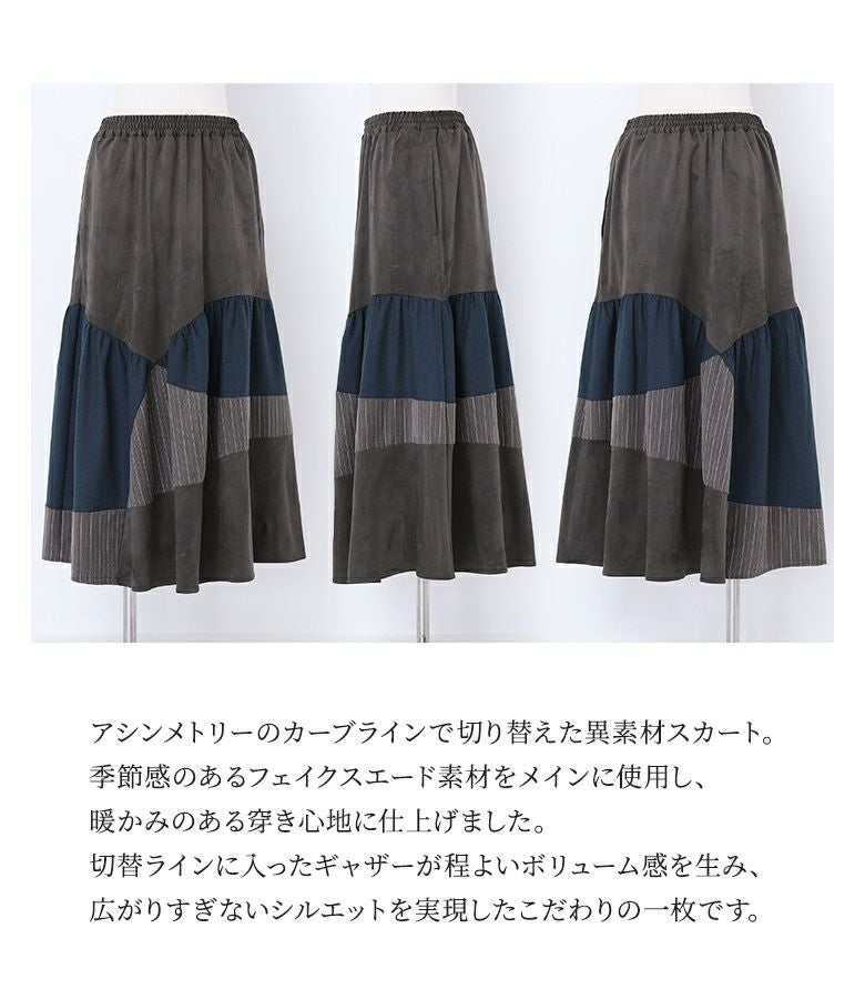 アシンメトリーのカーブラインで切り替えた異素材スカート。