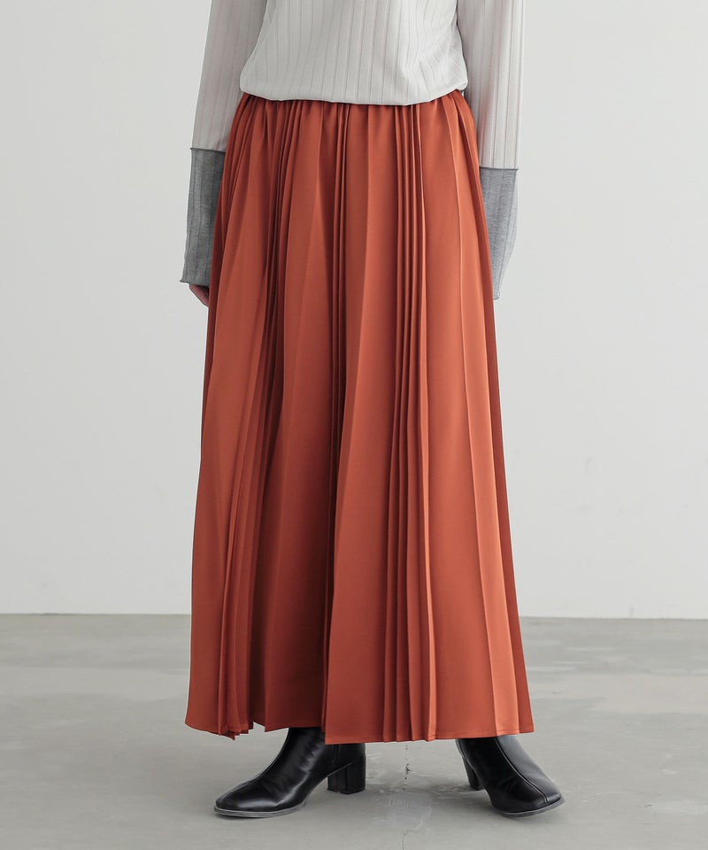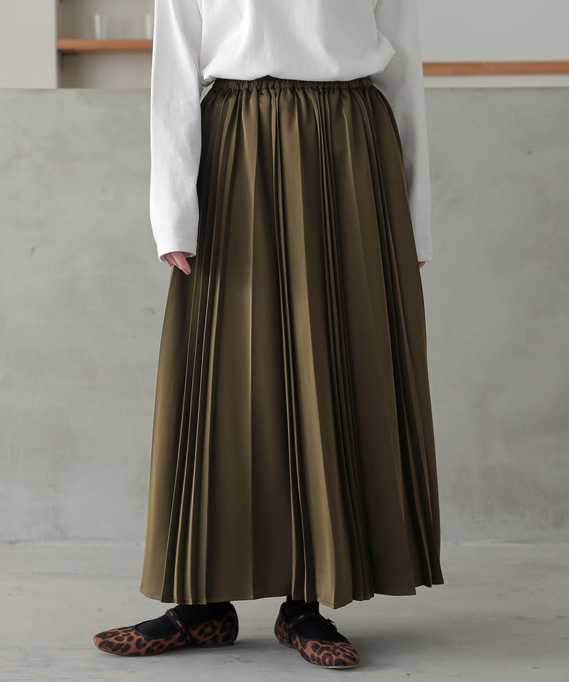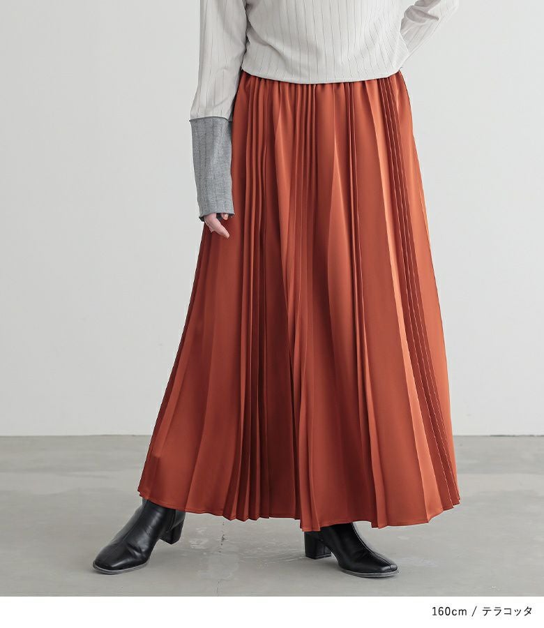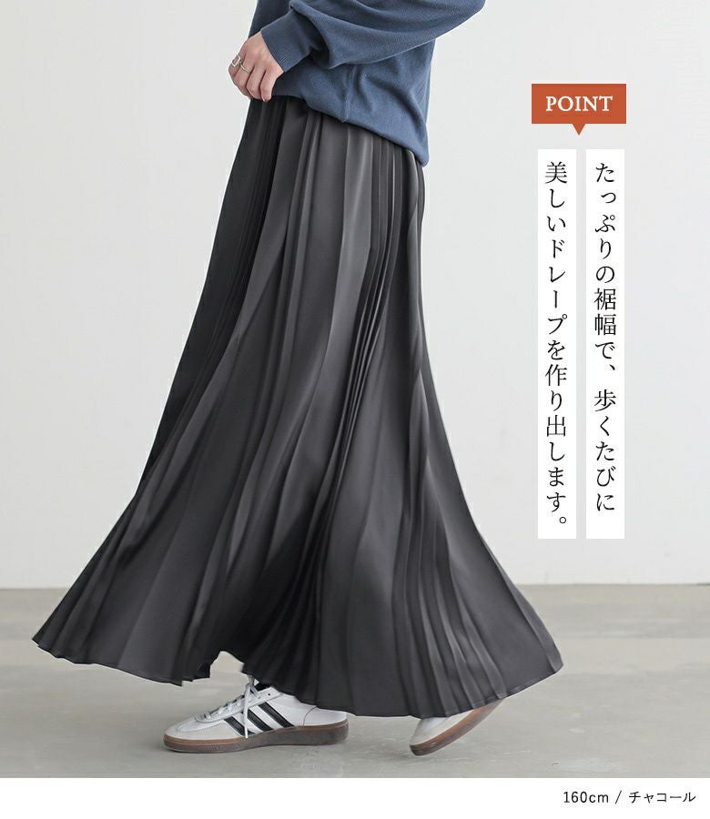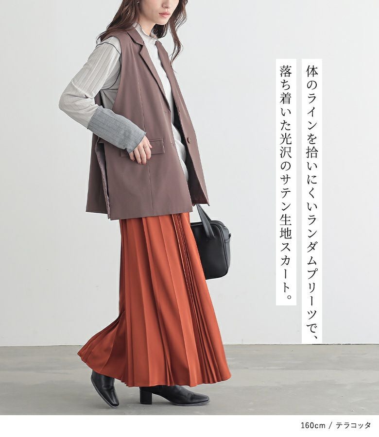 落ち着いた光沢のサテン生地ランダムプリーツスカート。