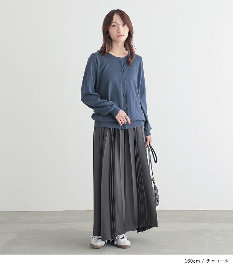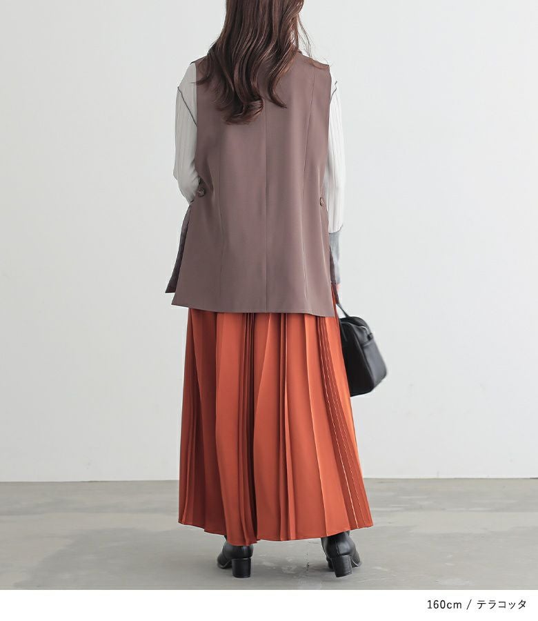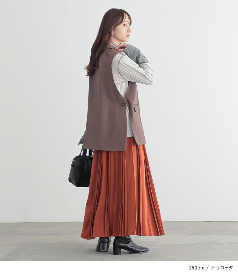 テラコッタ購入。サテンで悩みました。ツルツル光ってます。が、着てみたら明るくてキレイな色だし、生地感も大丈夫かも。プリーツも可愛いし、落ち感もあります。たくさん着たいです。