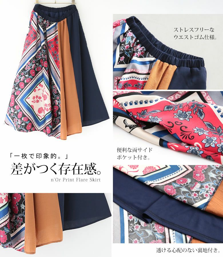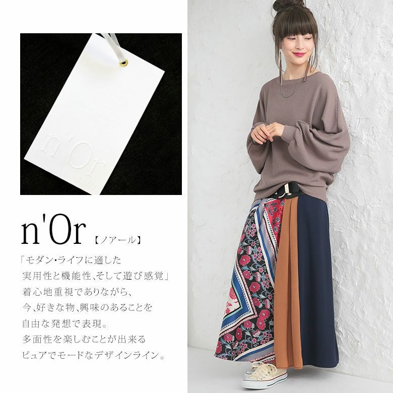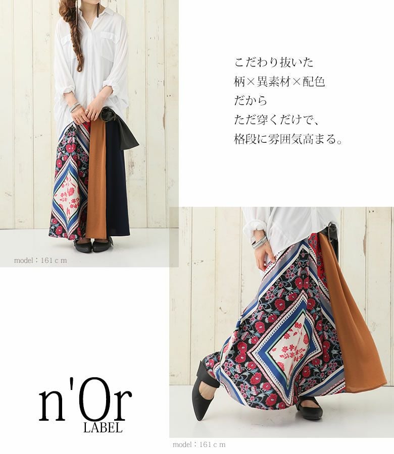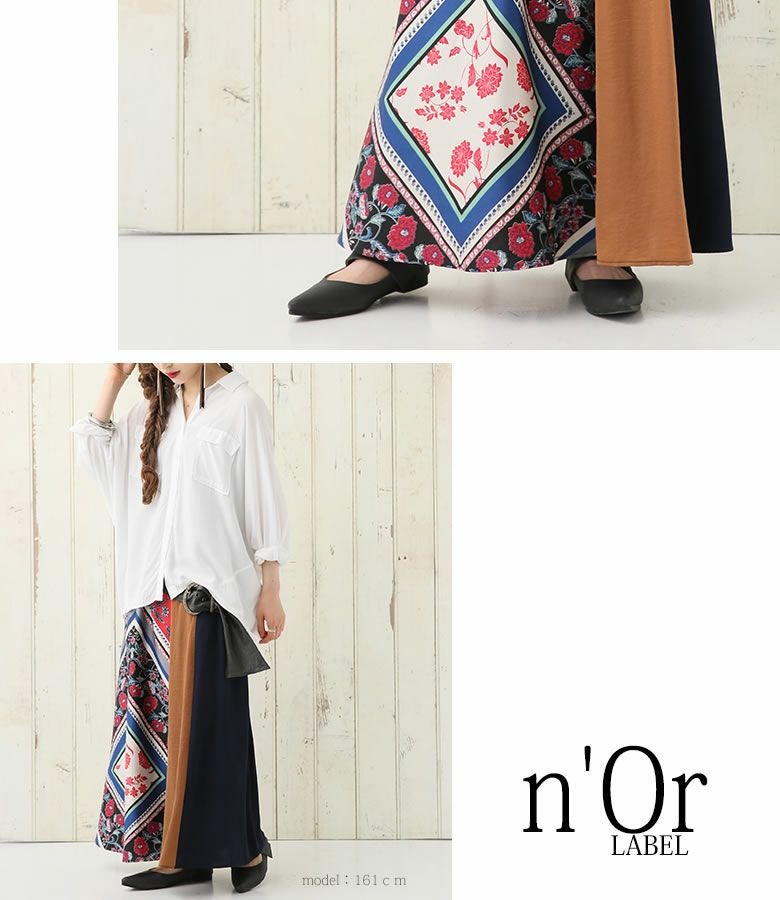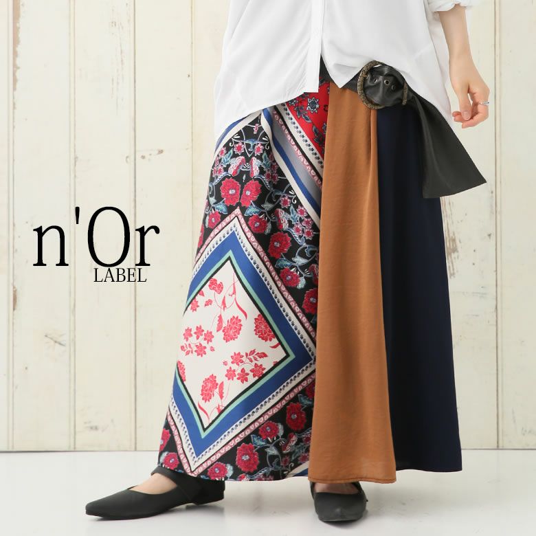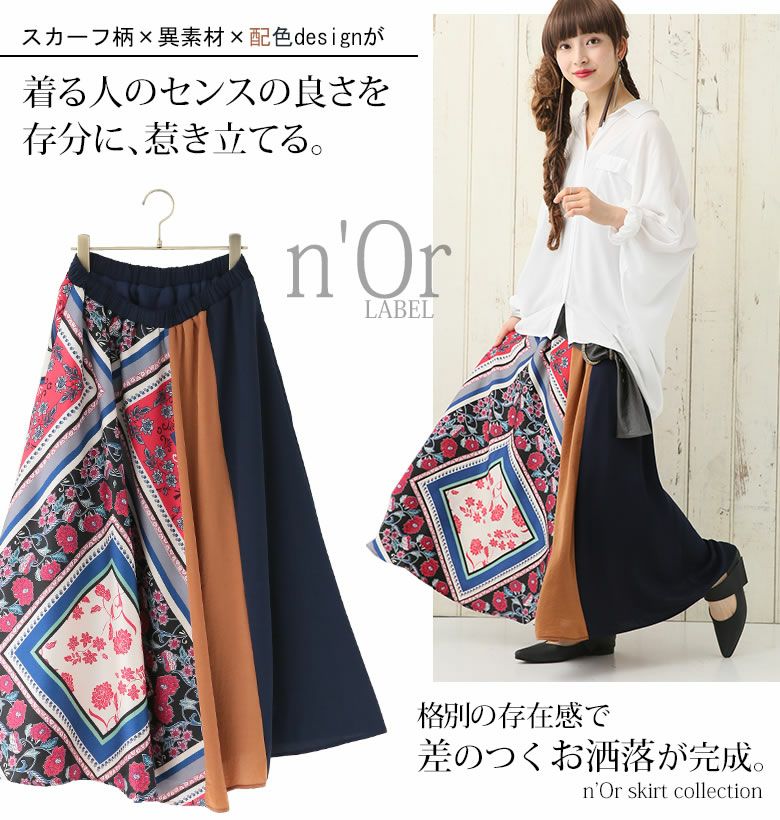 穿くだけで格段に雰囲気高まる≪n'OrLABEL≫異素材スカーフ柄切替スカートです。