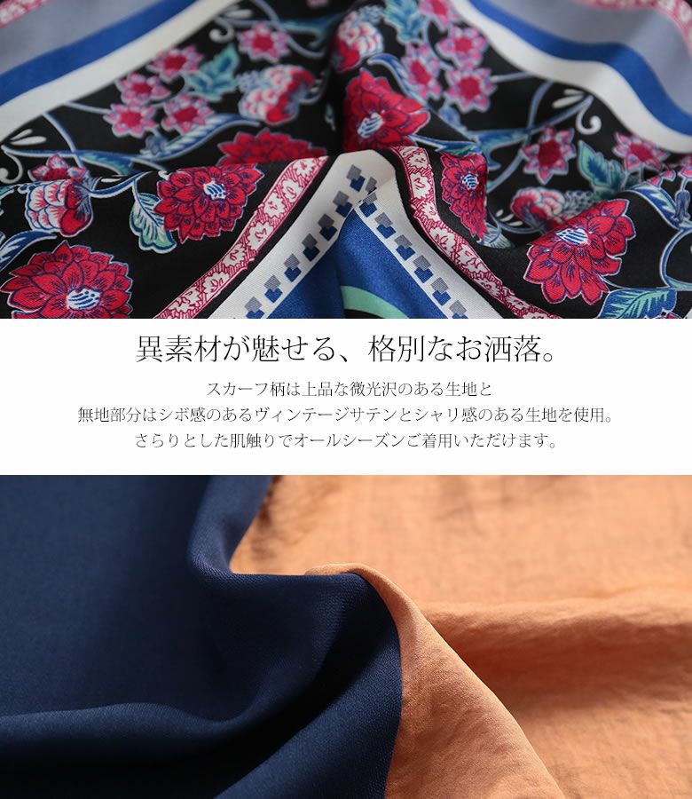 上品な光沢感のあるスカーフ生地と、無地部分にはシボ感のあるヴィンテージサテン×シャリ感のある生地を使用。