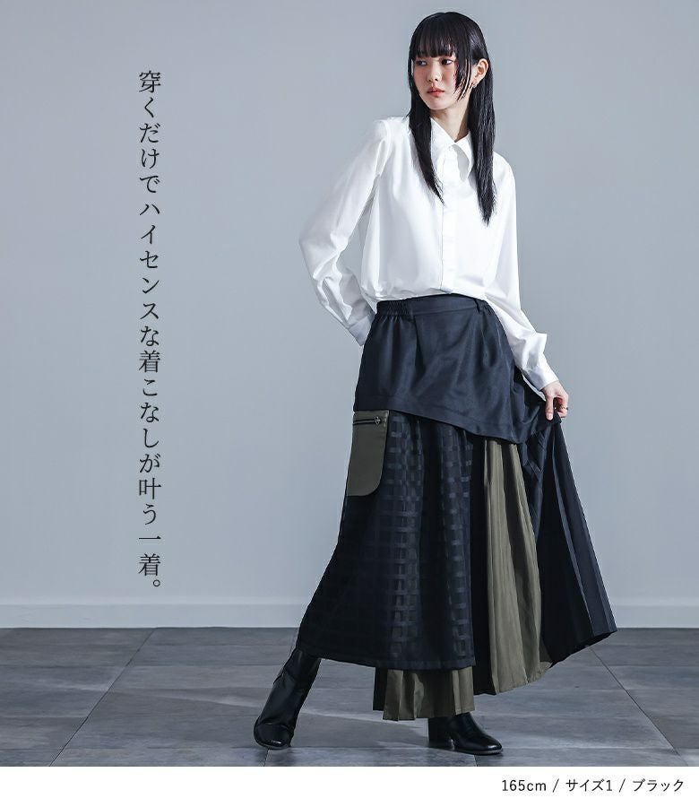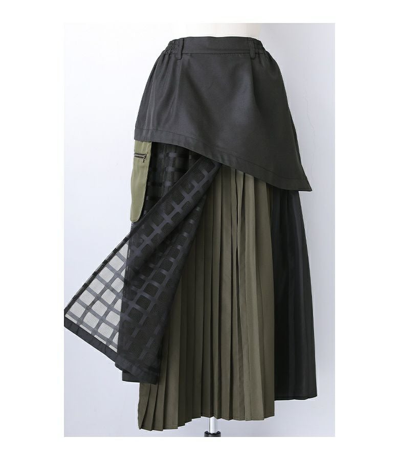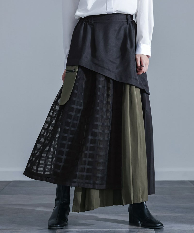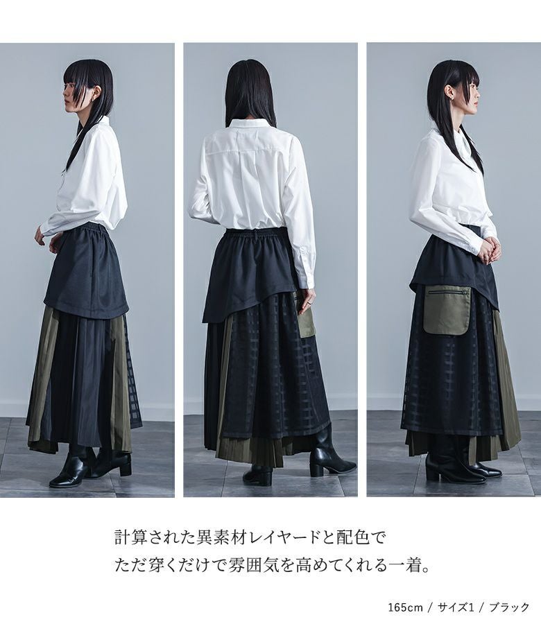 計算された異素材のレイヤード&配色でお洒落を語る、モードなデザインスカート。