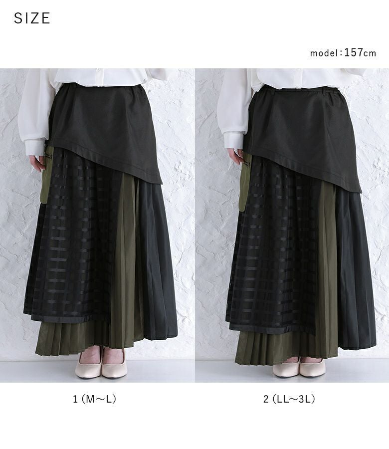 1(M~L)はウエスト、ヒップ共に程よいゆとりがありウエストゴムで楽な穿き心地でした。シンプルなトップスでもお洒落見えする動きのある綺麗なスカートです♪2(LL~3L)はウエストが少し大きいのでベルトがある方が安心のサイズ感でした。私の場合は、すっきり綺麗に穿けた1(M~L)を選びます。
