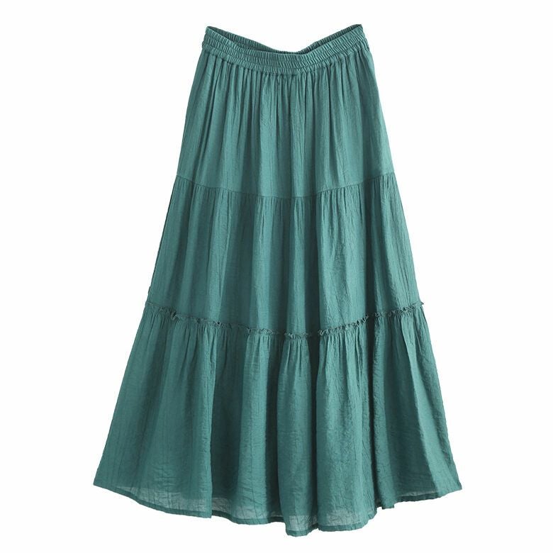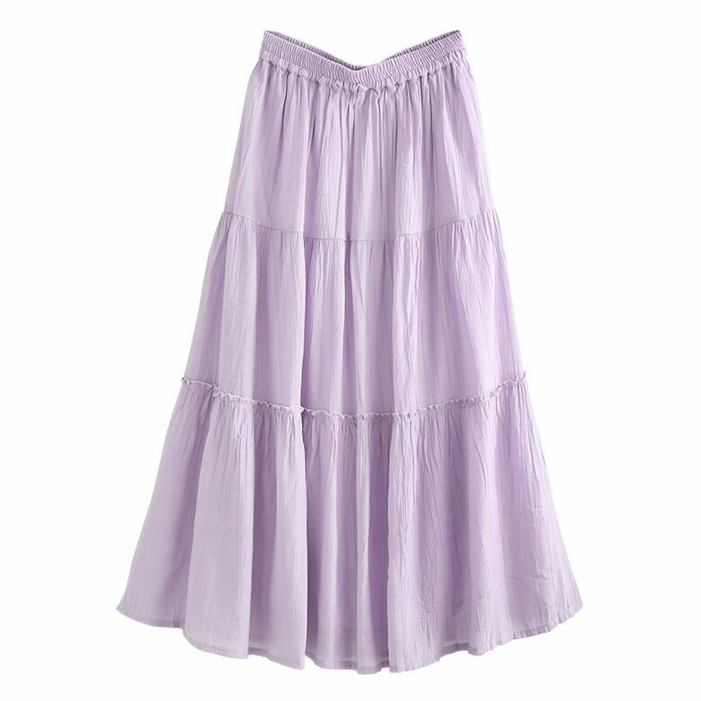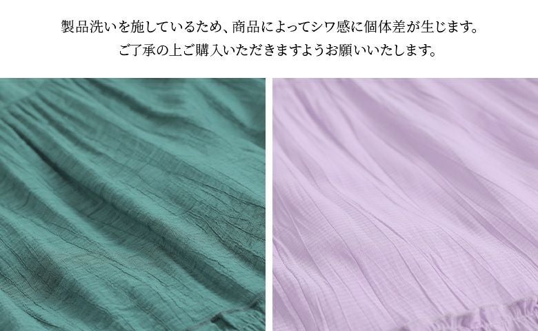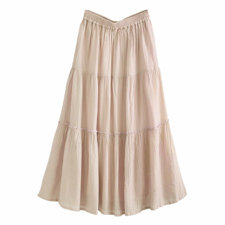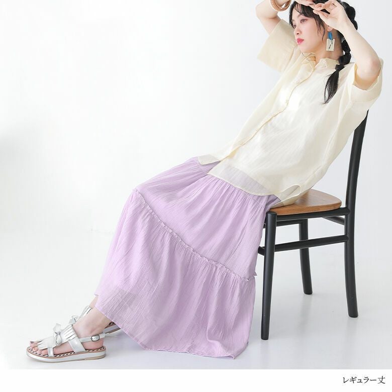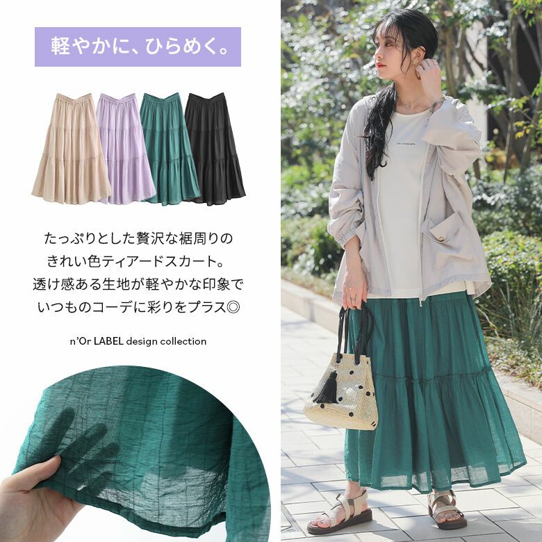 たっぷりとした贅沢な裾周りのきれい色ティアードスカート。透け感とシボ感のある生地が軽やかな印象で、いつものコーデに彩りをプラスします。