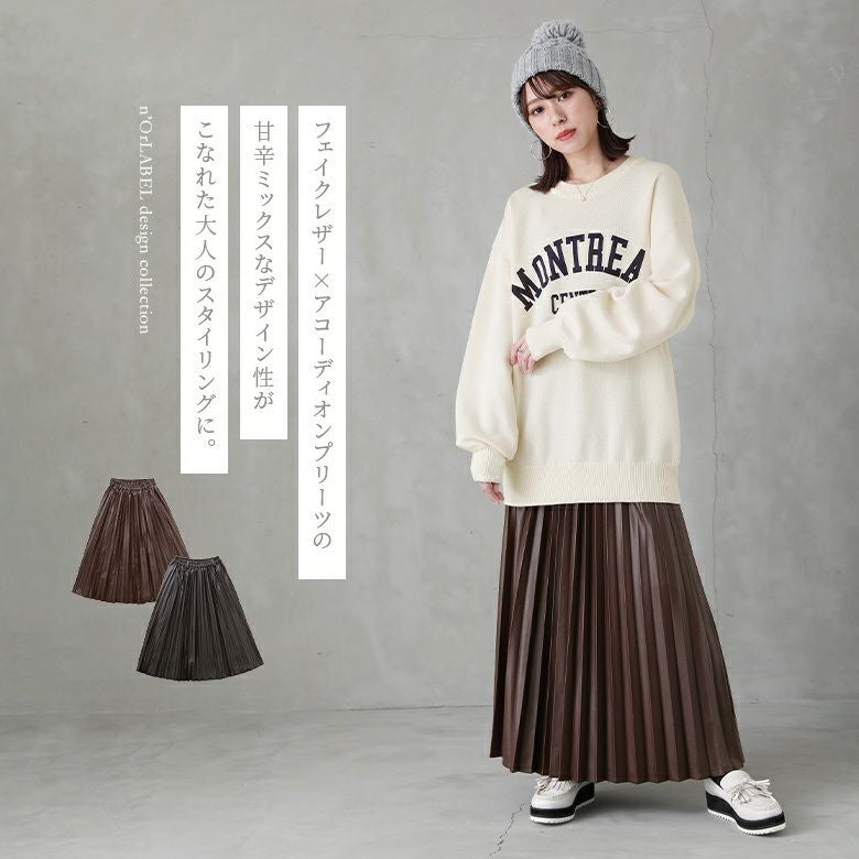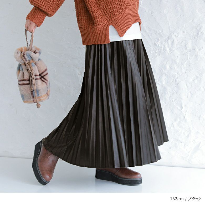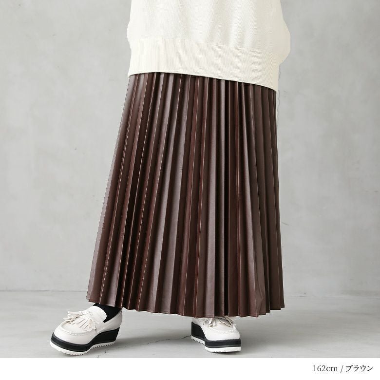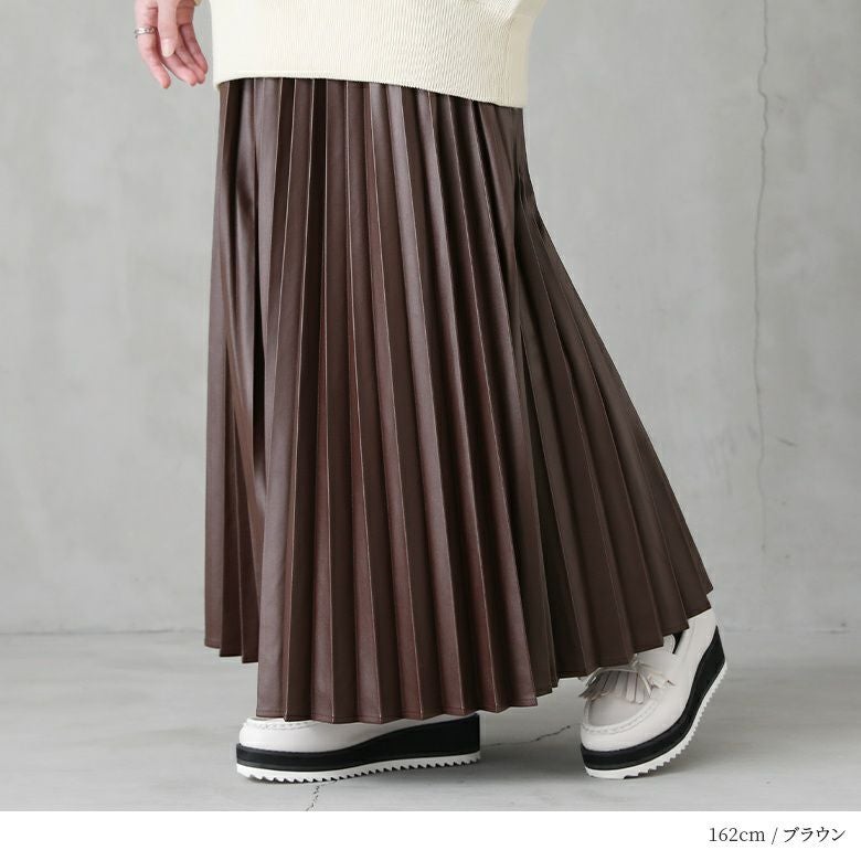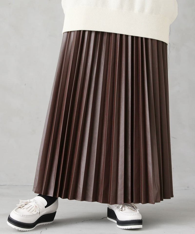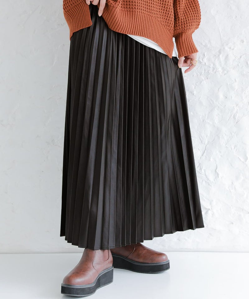 フェイクレザー×アコーディオンプリーツの甘辛ミックスなデザイン性がこなれた大人のスタイリングになるロングスカート。