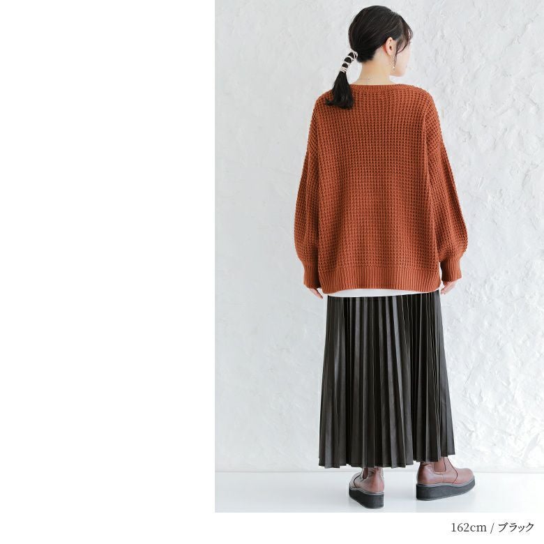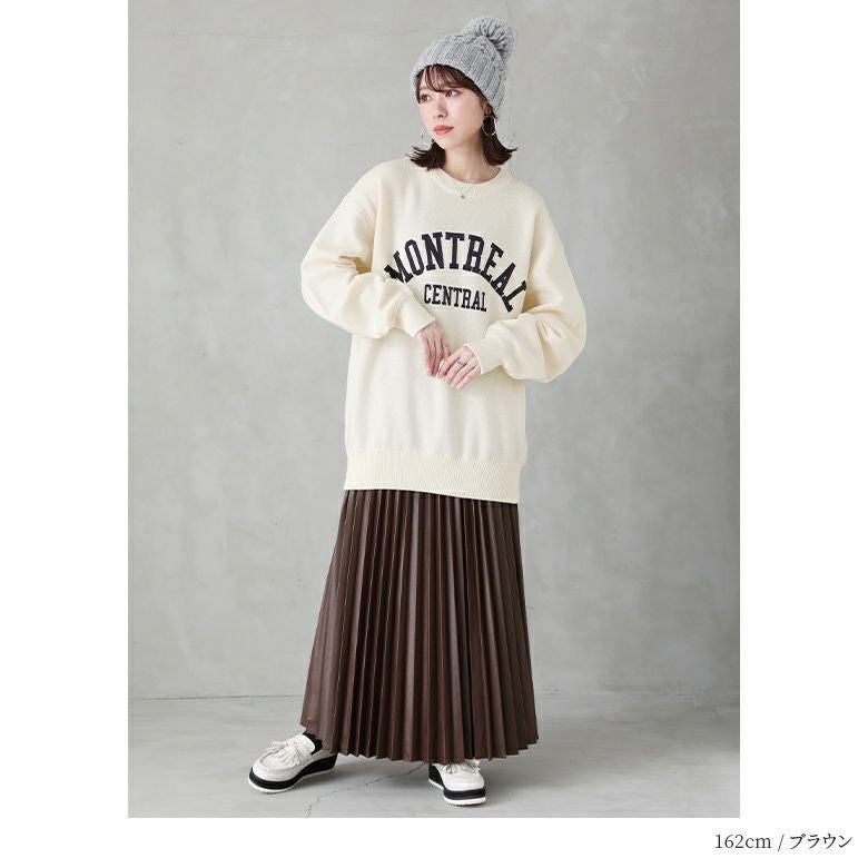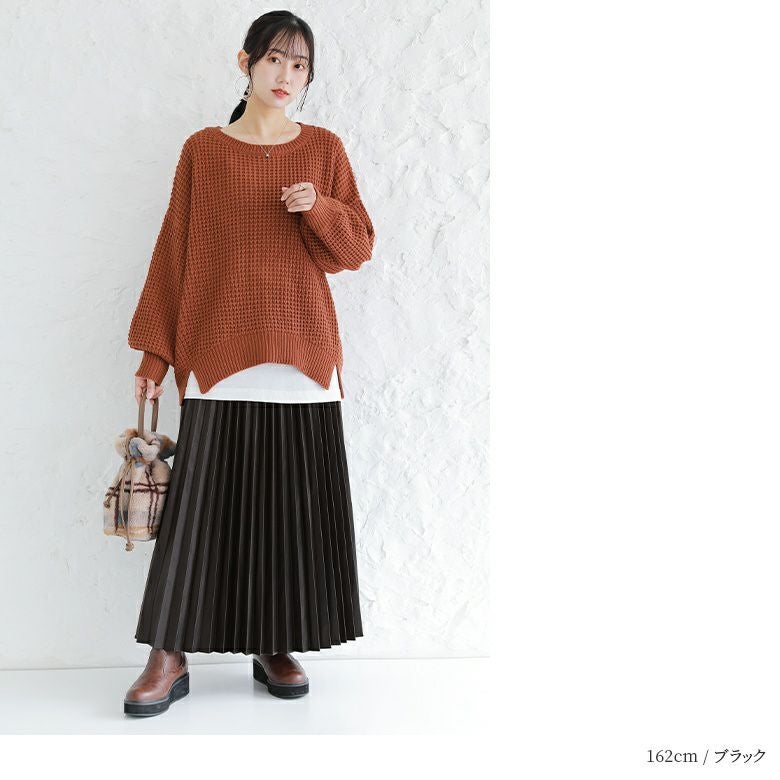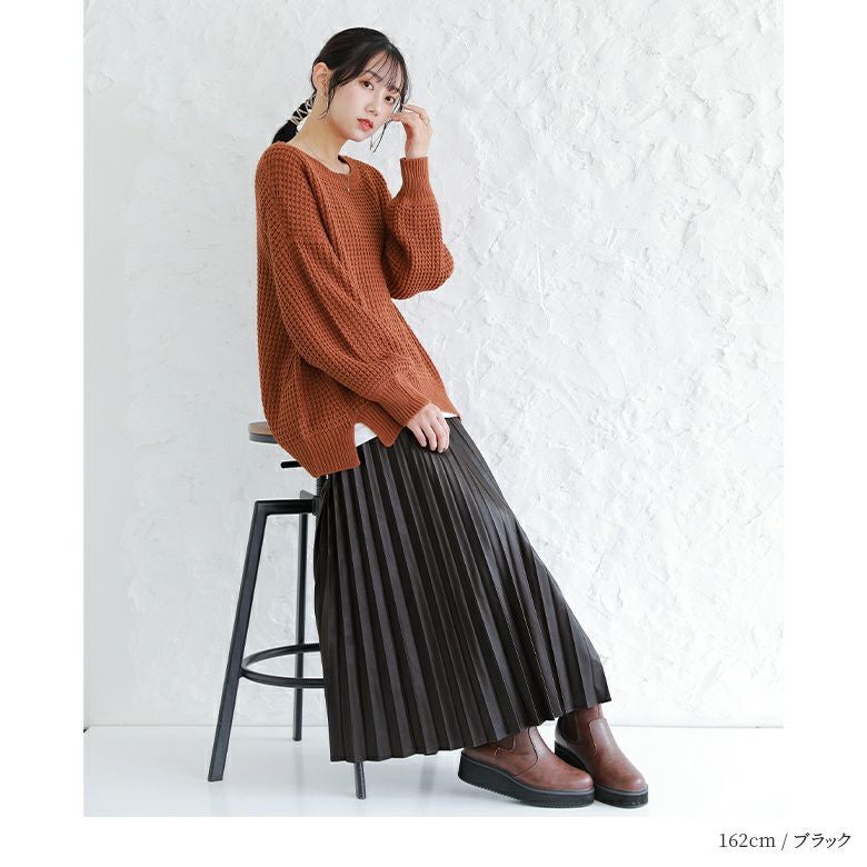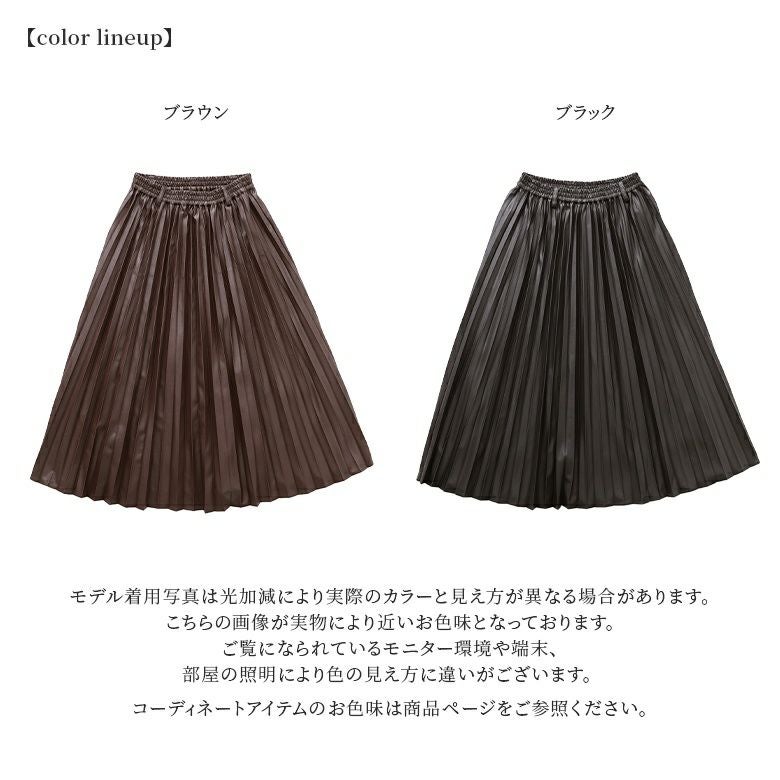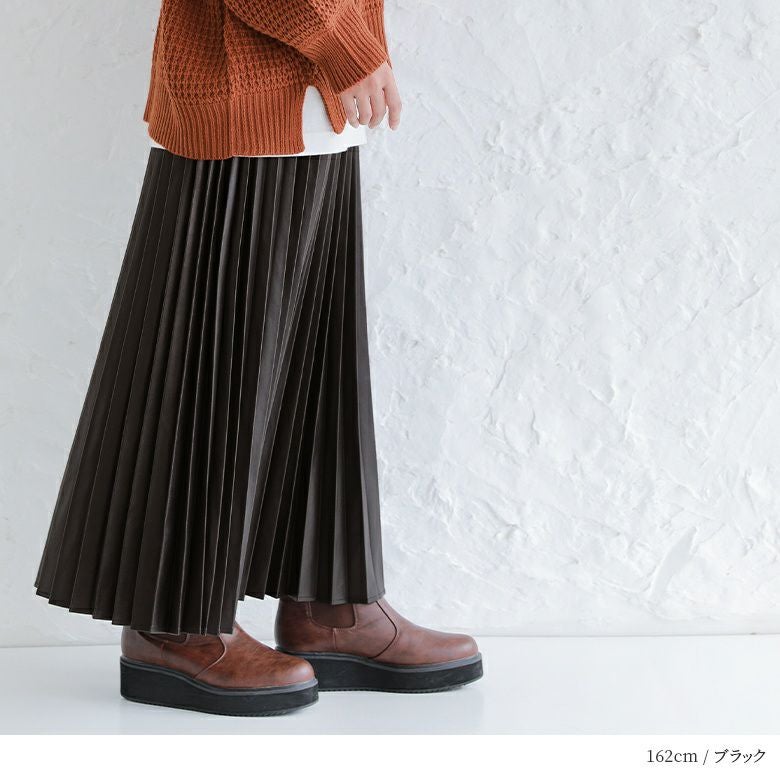 フェイクレザー×アコーディオンプリーツの甘辛ミックスなデザイン性がこなれた大人のスタイリングになるロングスカート。