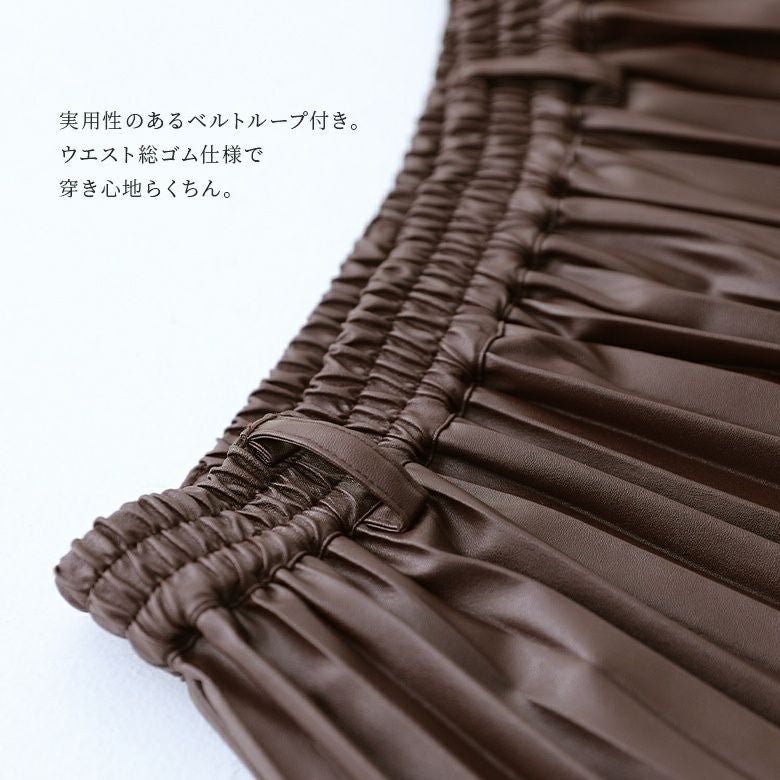 プリーツ幅をウエストから裾に向かって広げることで、揺れ感のある理想的なシルエットに。実用性のあるベルトループ付き。ウエスト総ゴム仕様で穿き心地楽ちん♪