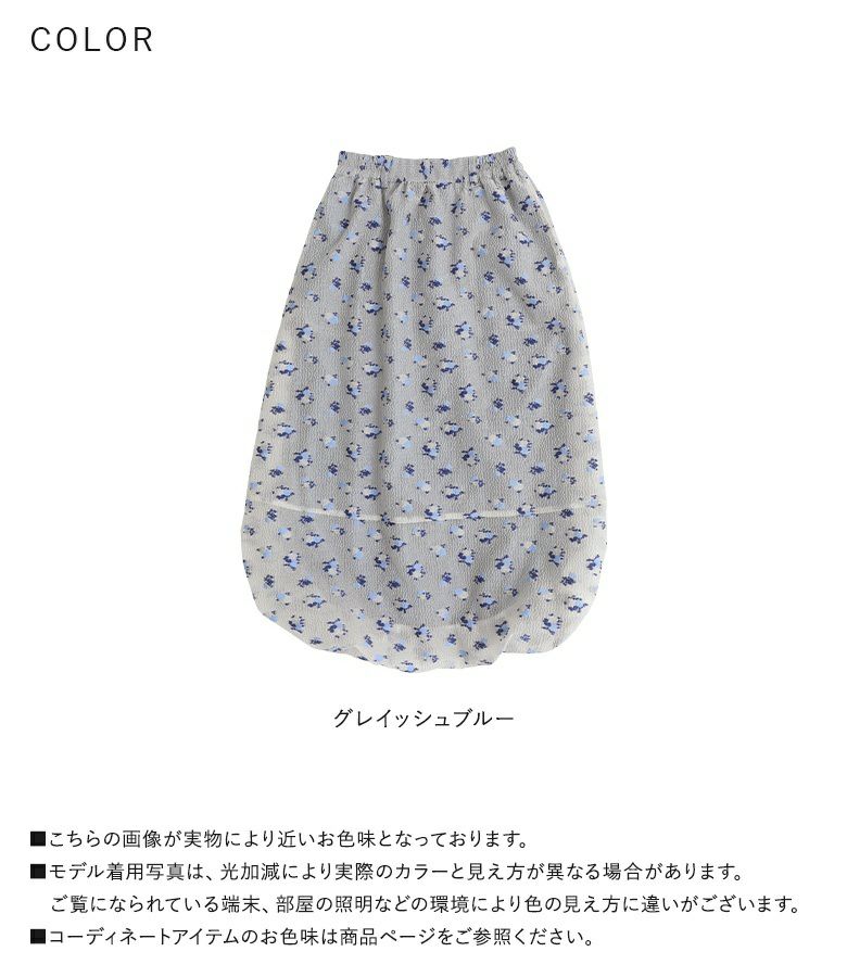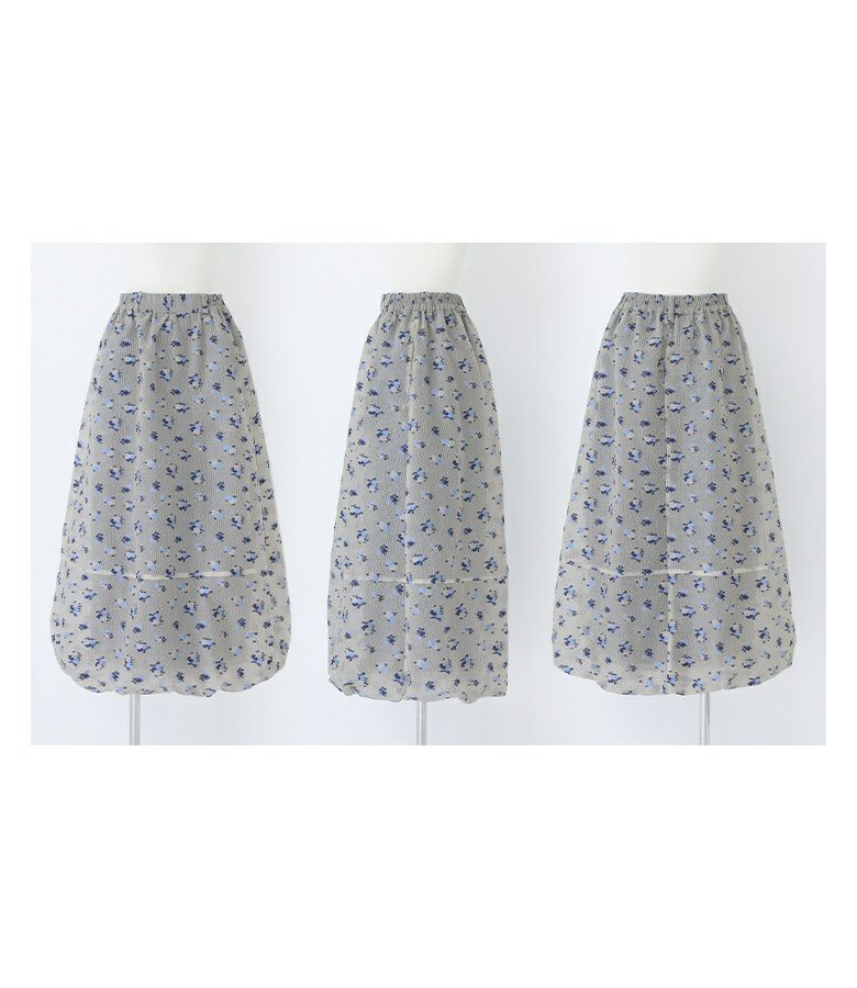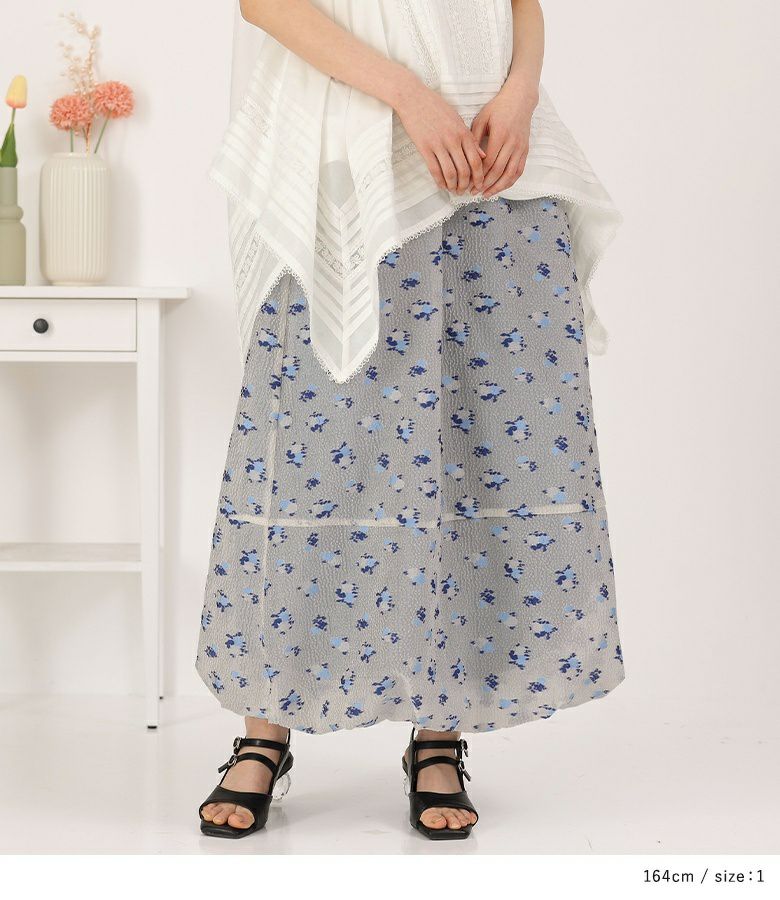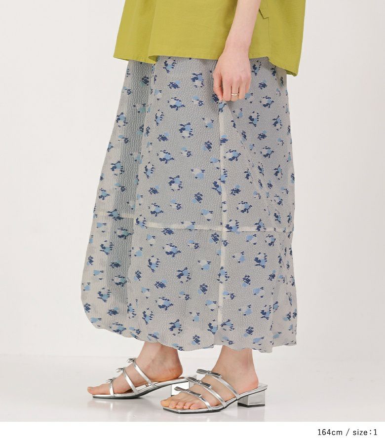 絵画調の小花柄が大人の可愛さを引き立てるバルーンスカート。ボリュームの出過ぎないマキシ丈で幼くなり過ぎず大人っぽい雰囲気の一枚です。裏地のブルーがうっすら透けて見える、ほんのりとした透け感と控えめな色合いがポイント。裾にはゴムを入れ、歩行時に裾が引っ掛かりにくいように工夫しました。