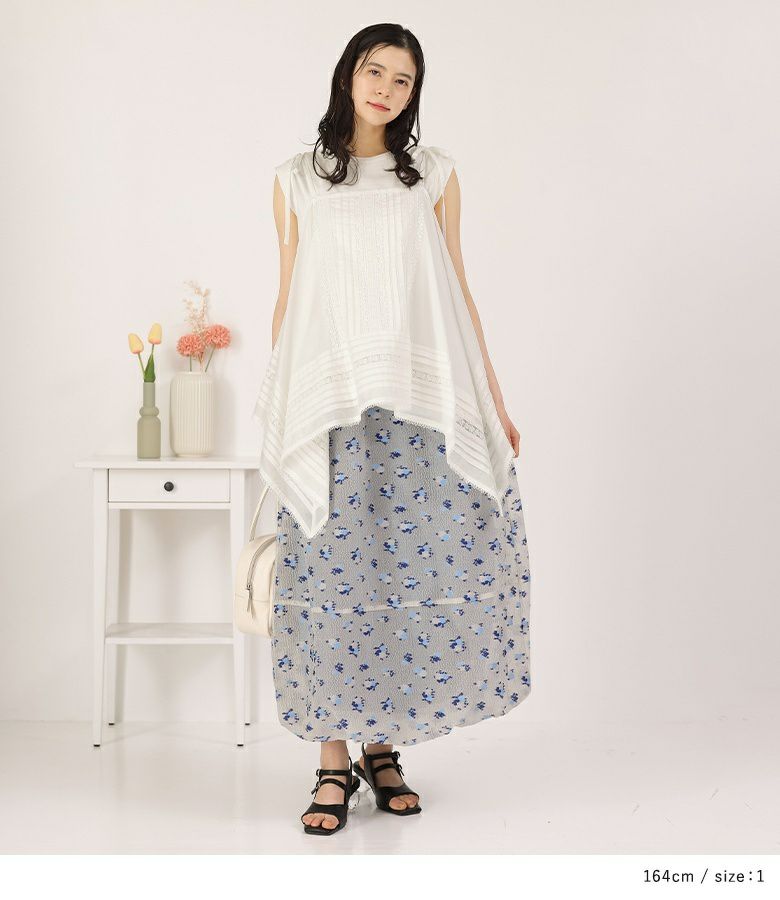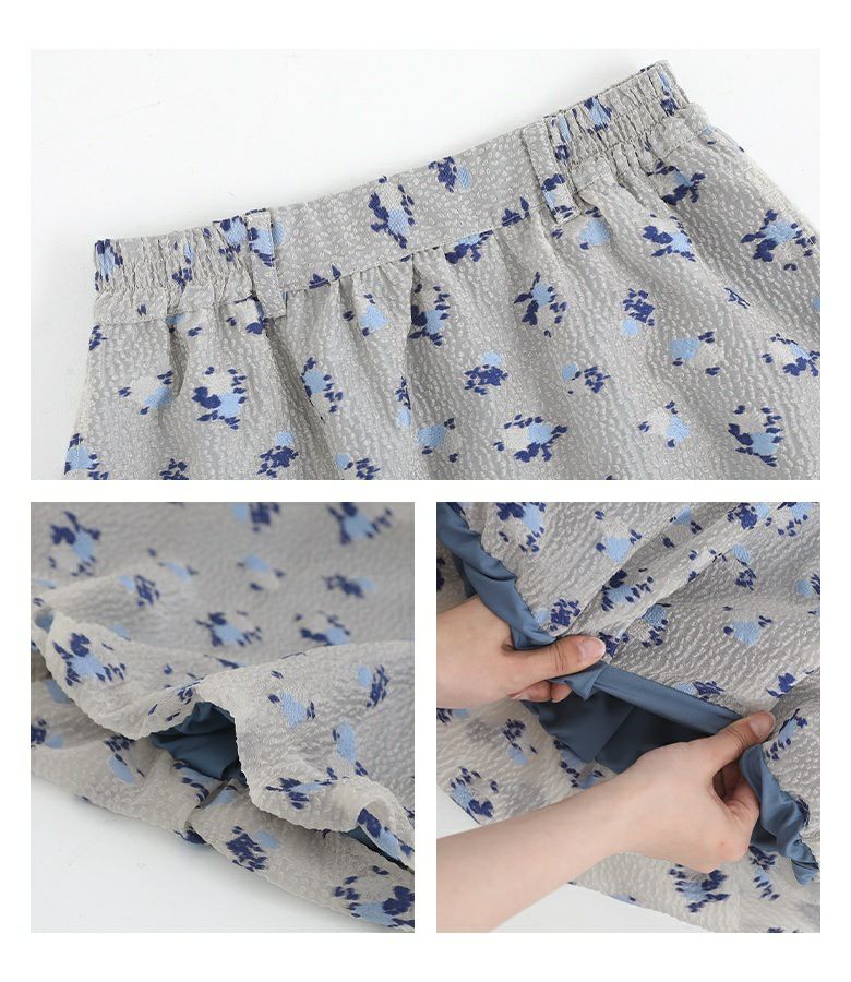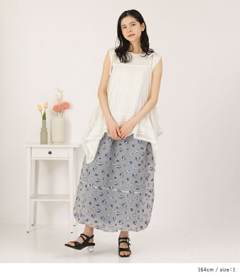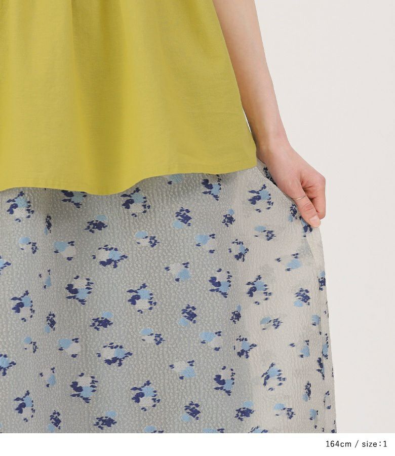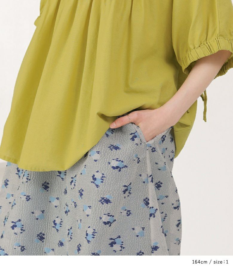 絵画調の小花柄が大人の可愛さを引き立てるバルーンスカート。ボリュームの出過ぎないマキシ丈で幼くなり過ぎず大人っぽい雰囲気の一枚です。裏地のブルーがうっすら透けて見える、ほんのりとした透け感と控えめな色合いがポイント。裾にはゴムを入れ、歩行時に裾が引っ掛かりにくいように工夫しました。