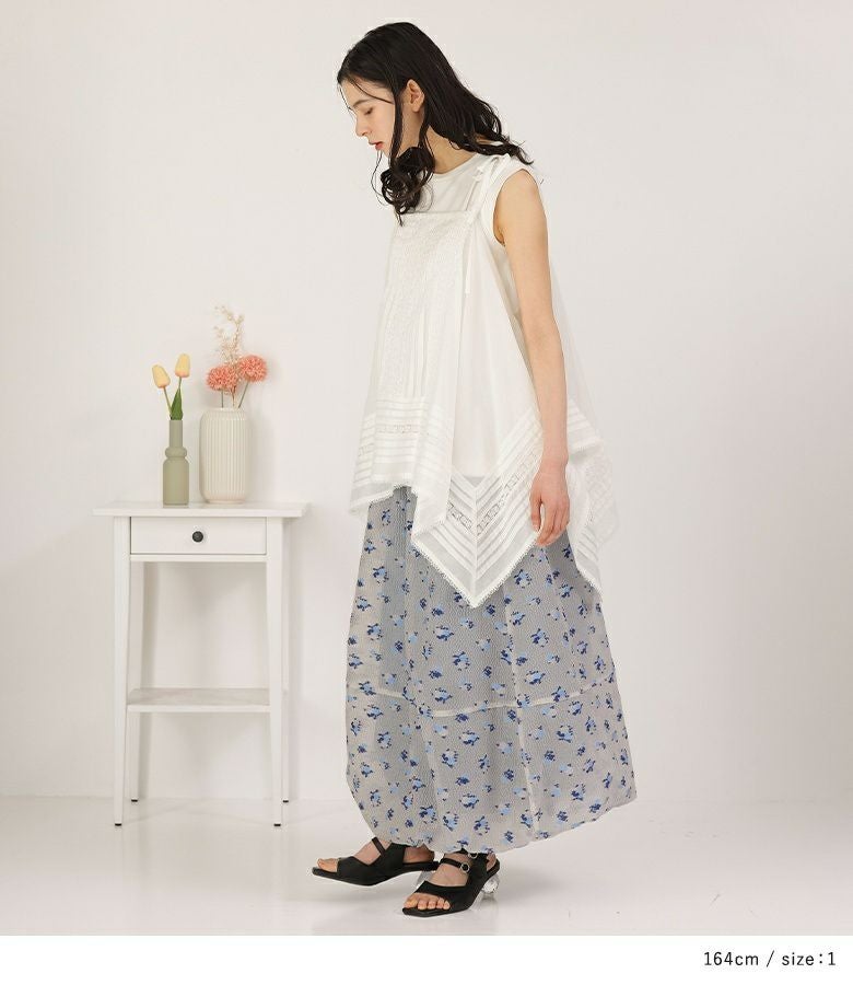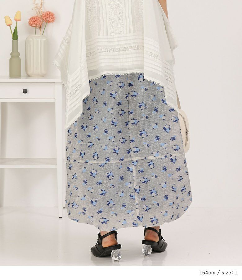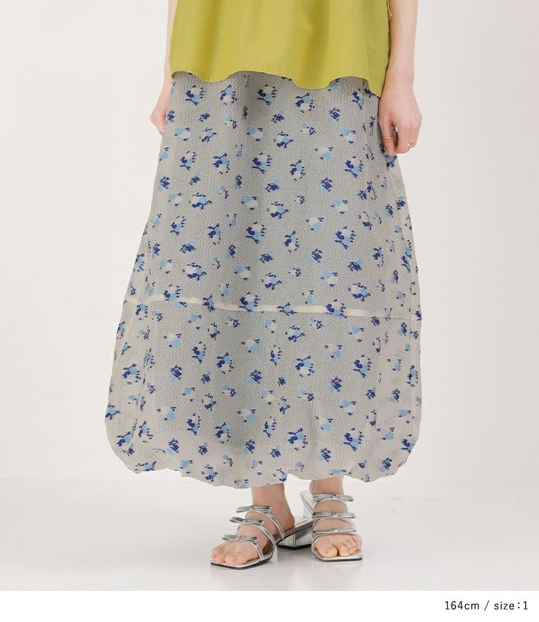 絵画調の小花柄が大人の可愛さを引き立てるバルーンスカート。ボリュームの出過ぎないマキシ丈で幼くなり過ぎず大人っぽい雰囲気の一枚です。裏地のブルーがうっすら透けて見える、ほんのりとした透け感と控えめな色合いがポイント。裾にはゴムを入れ、歩行時に裾が引っ掛かりにくいように工夫しました。
