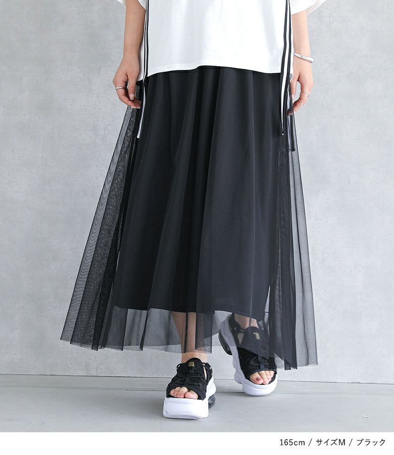 軽やかなチュールを重ねた、ほどよい透け感が魅力のスカート。やわらかく落ち感のある素材が動きに合わせて揺れ、抜け感のあるスタイルに仕上がります。シンプルな中にも表情があり、柄違いで揃えたくなるデザイン。ウエストはゴム仕様で、快適な着心地もうれしいポイントです。