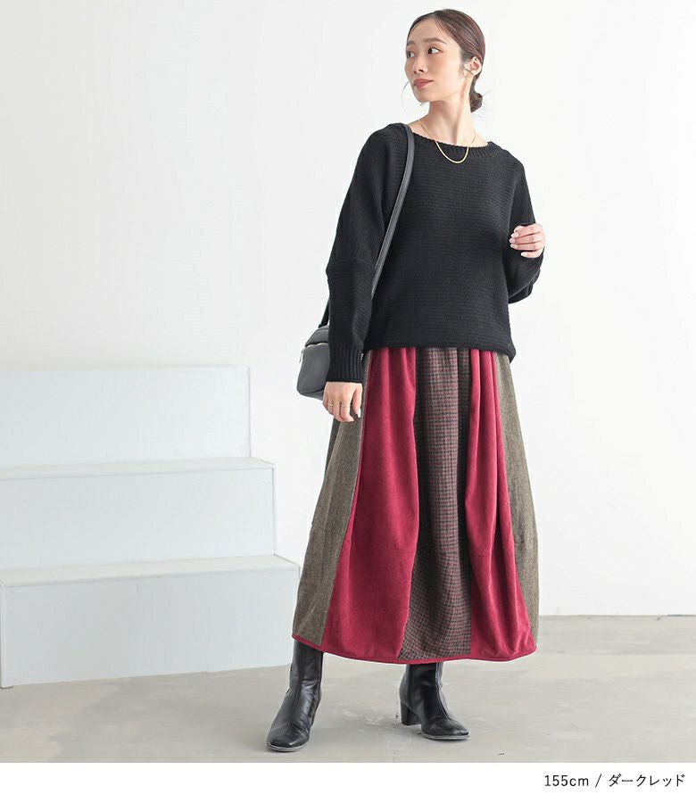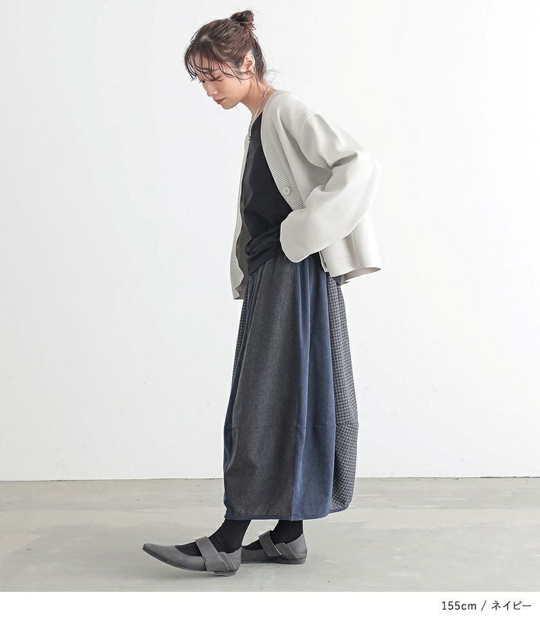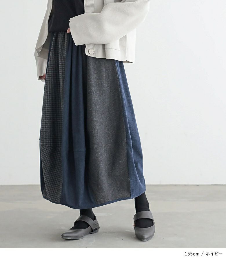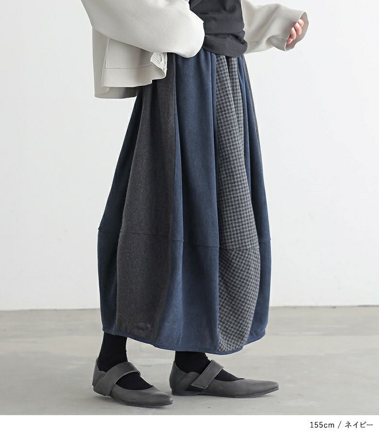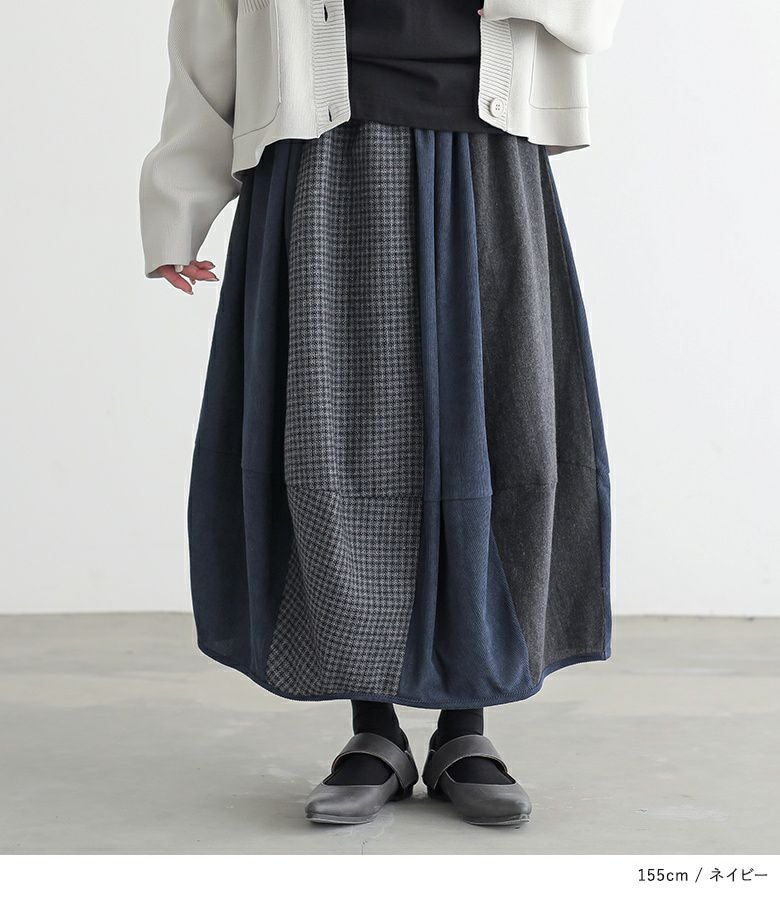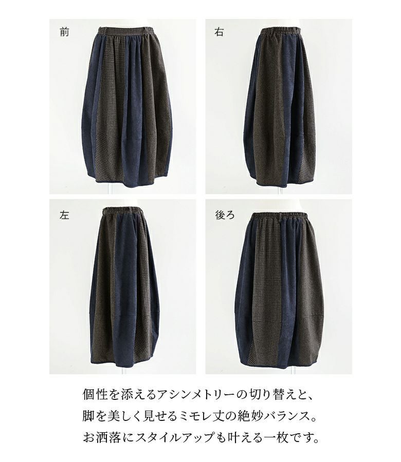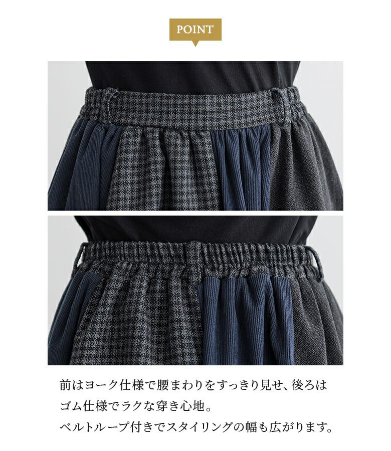 差し色になる無地×チェック柄、季節感溢れるコーデュロイ×ツイードの、素材にもデザインにもこだわったアシメ仕様。3種類の生地を配色で切り替えた異素材ドッキングスカートで360度お洒落魅せが実現します。