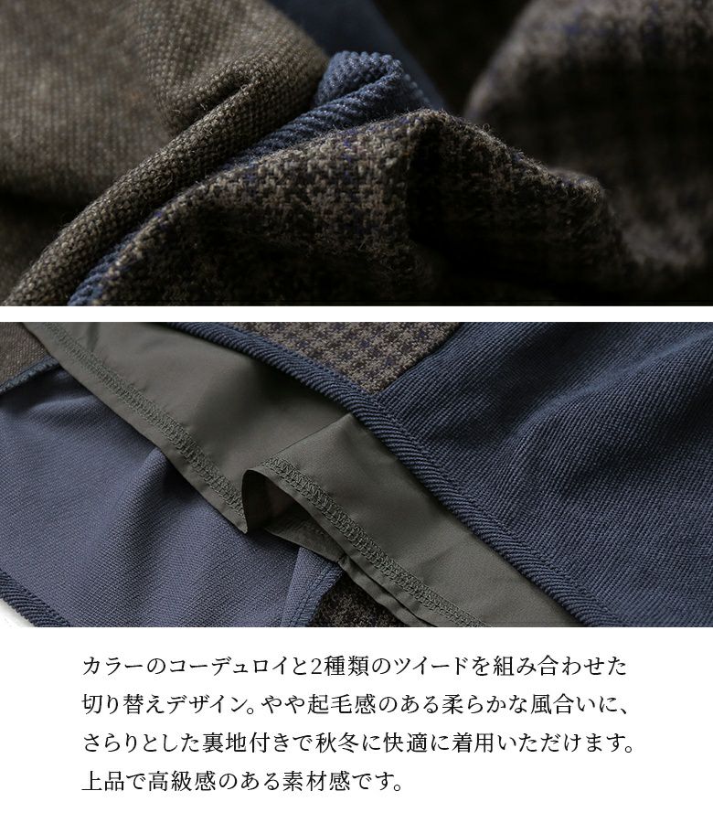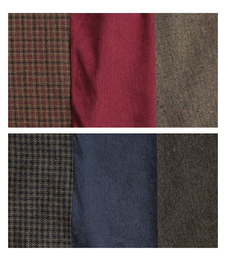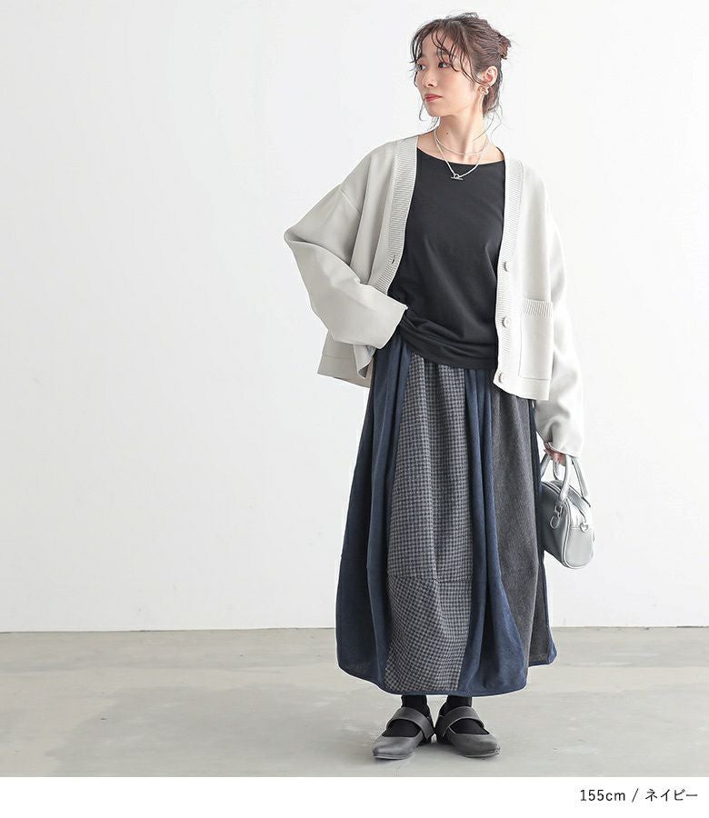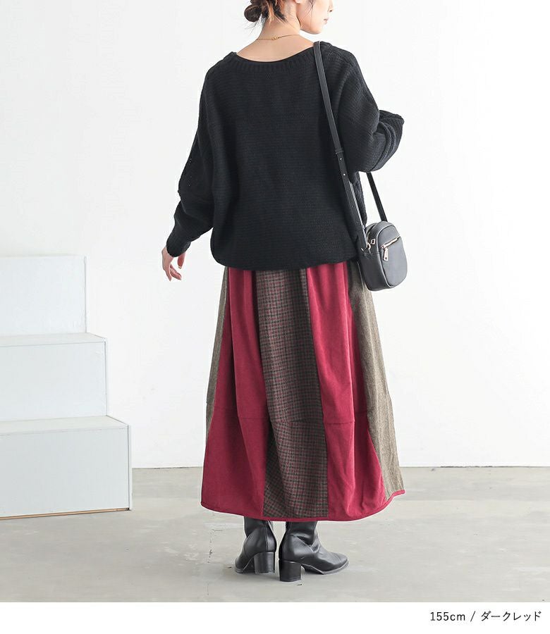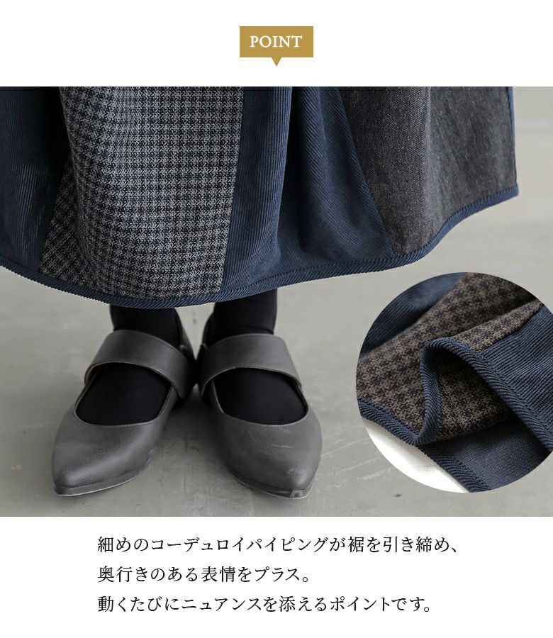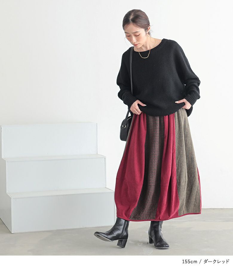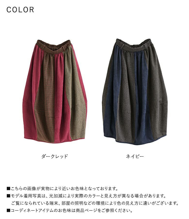差し色になる無地×チェック柄、季節感溢れるコーデュロイ×ツイードの、素材にもデザインにもこだわったアシメ仕様。3種類の生地を配色で切り替えた異素材ドッキングスカートで360度お洒落魅せが実現します。