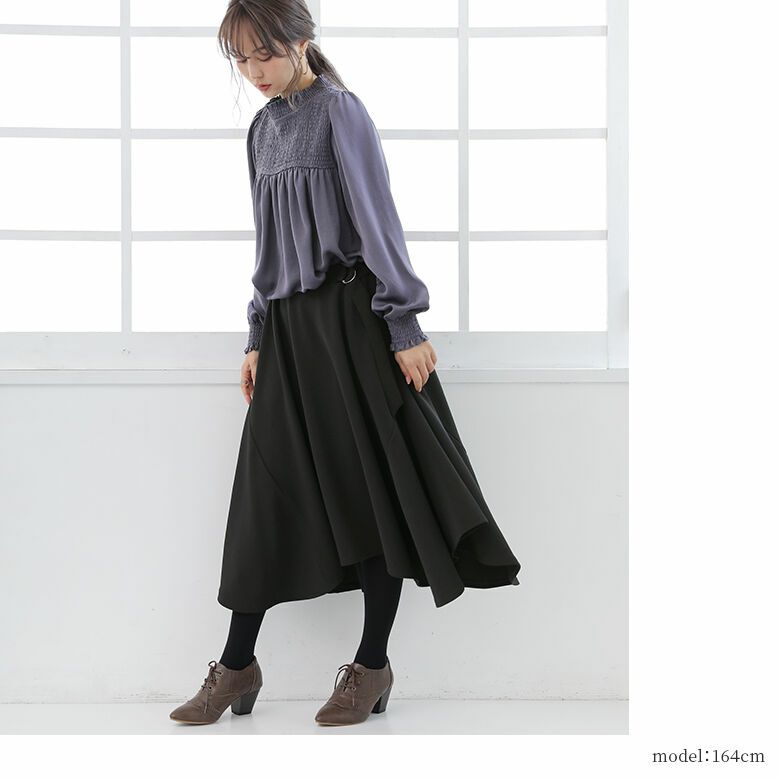 生地を贅沢に使用した切替デザインが、ただ穿くだけで美しいシルエットを生み出す。異素材のウエストベルトを垂らしたデザインが、着こなしにニュアンスをプラスします。