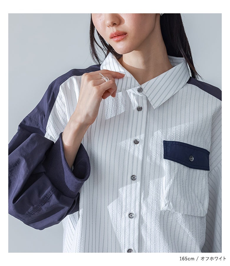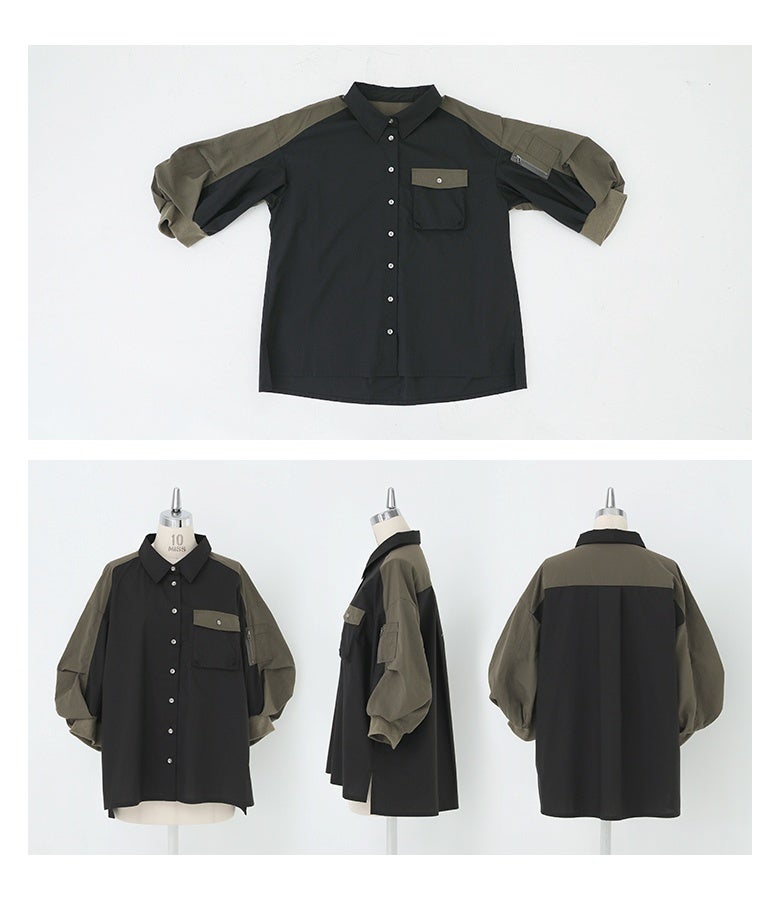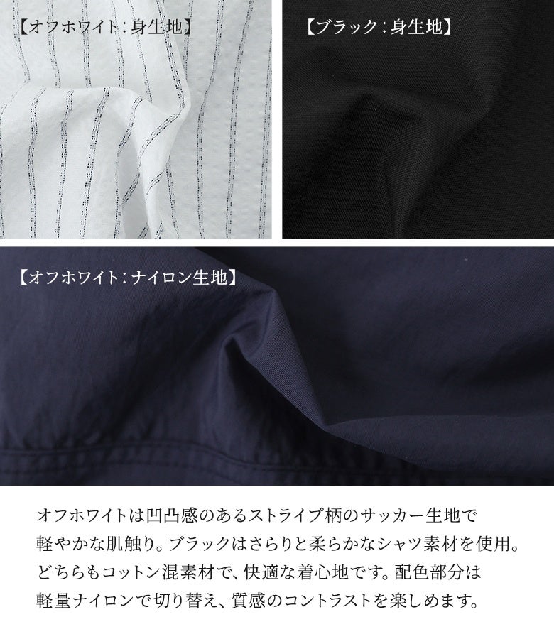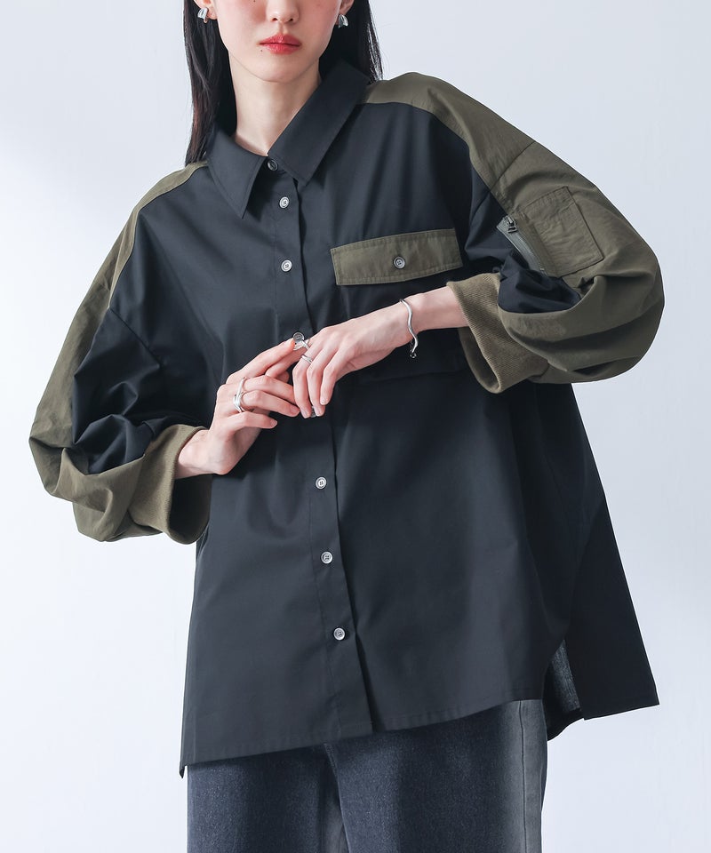 シャツ生地×ナイロン生地の異素材ドッキングシャツ。