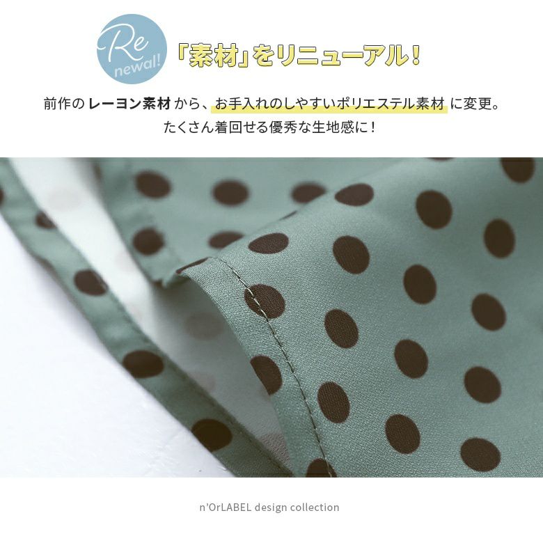 前作のレーヨン素材から、お手入れのしやすいポリエステル素材に変更し、たくさん着回せる優秀な生地感に。