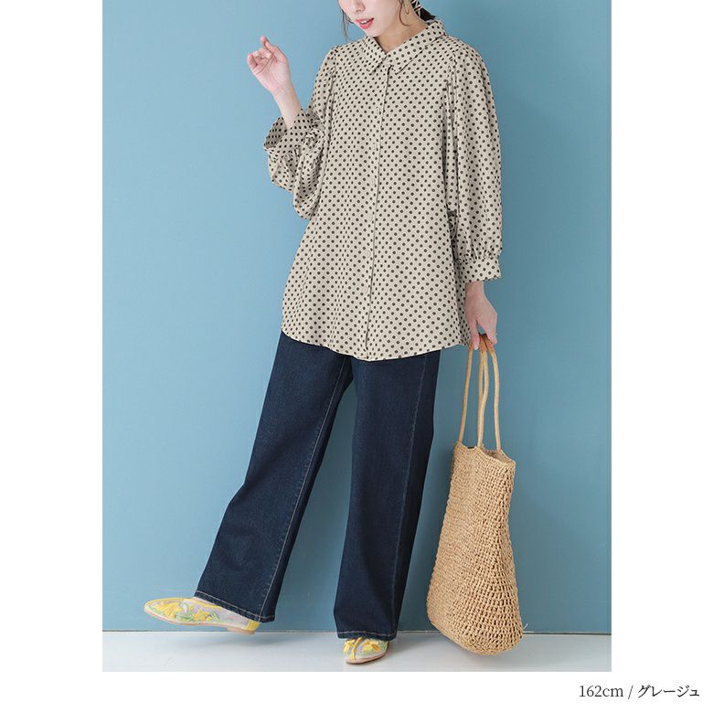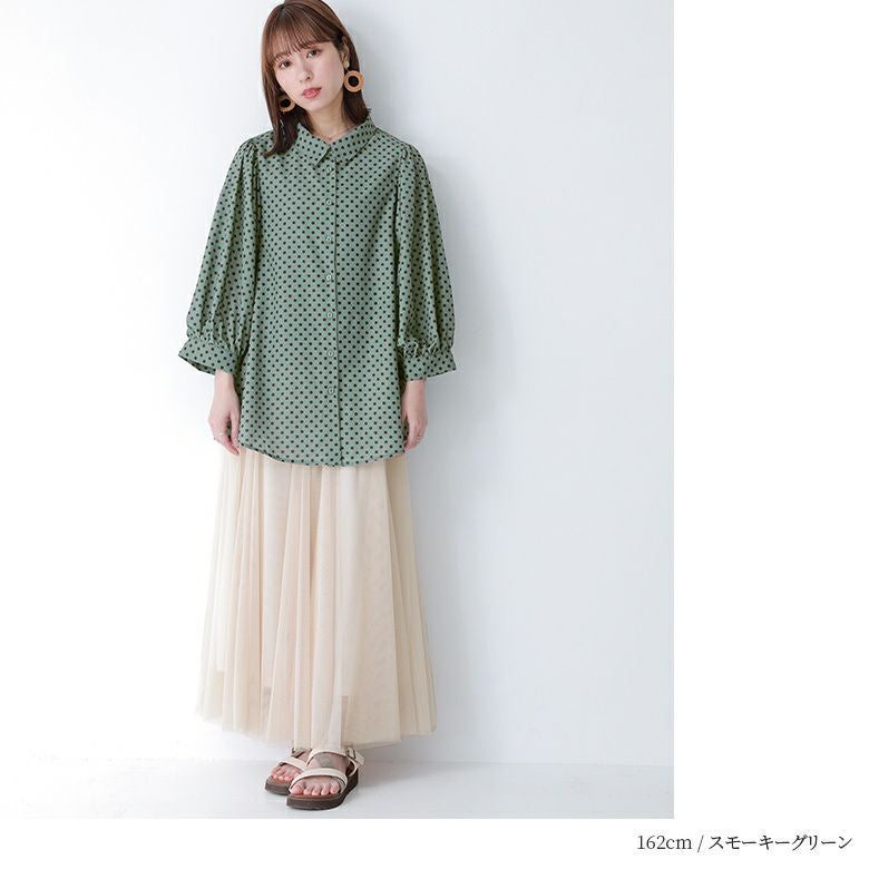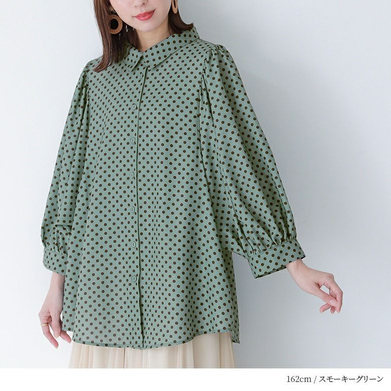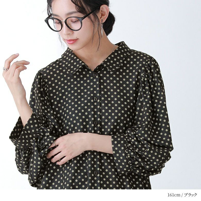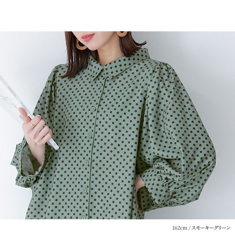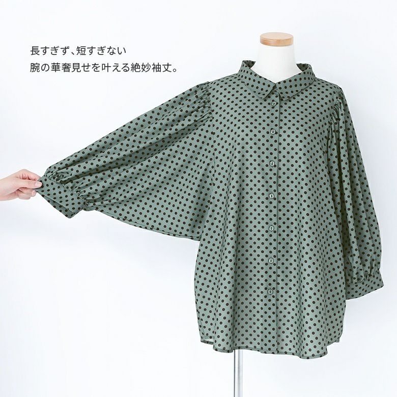 たっぷりボリュームのあるパフスリーブと落ち着いた色合いのドット柄が大人可愛い印象に惹きたててくれる。