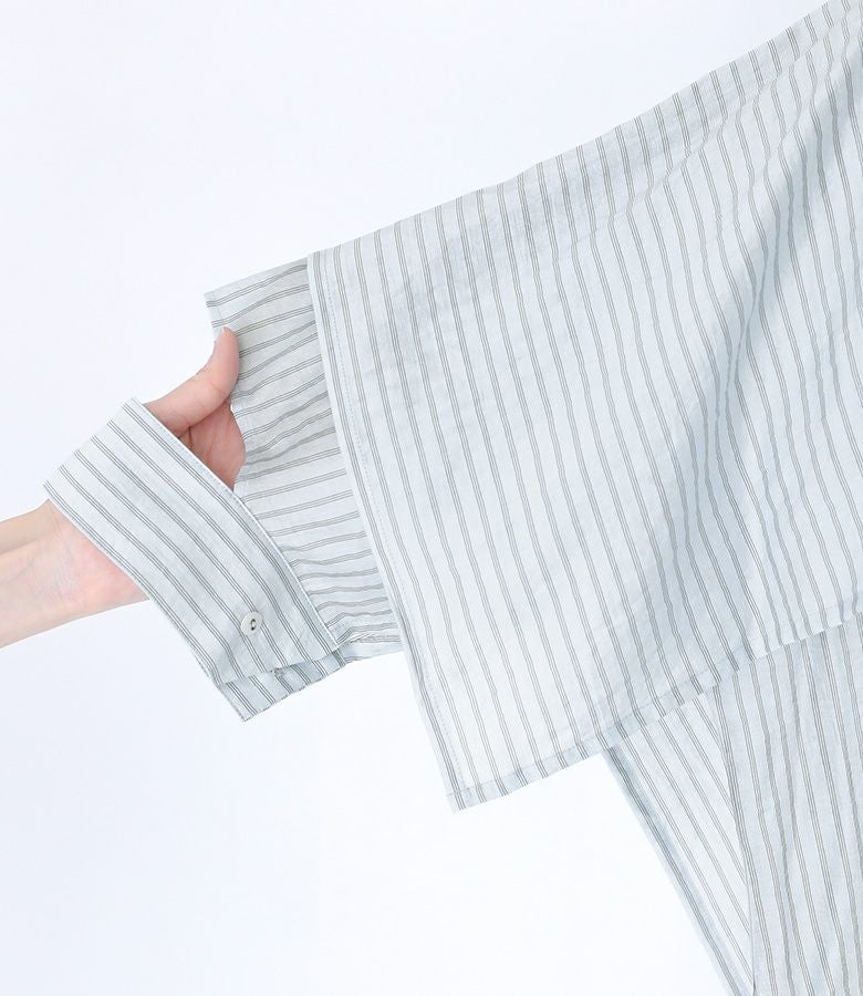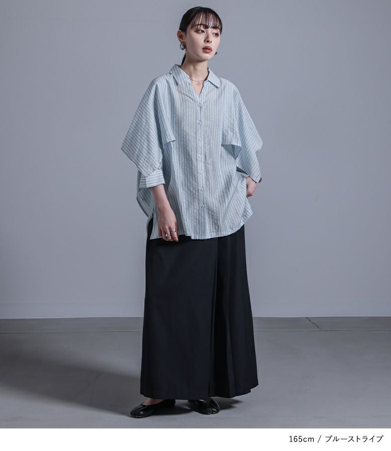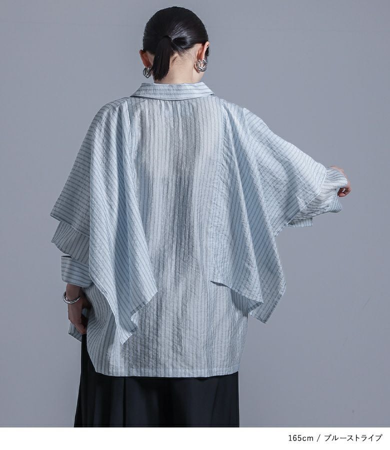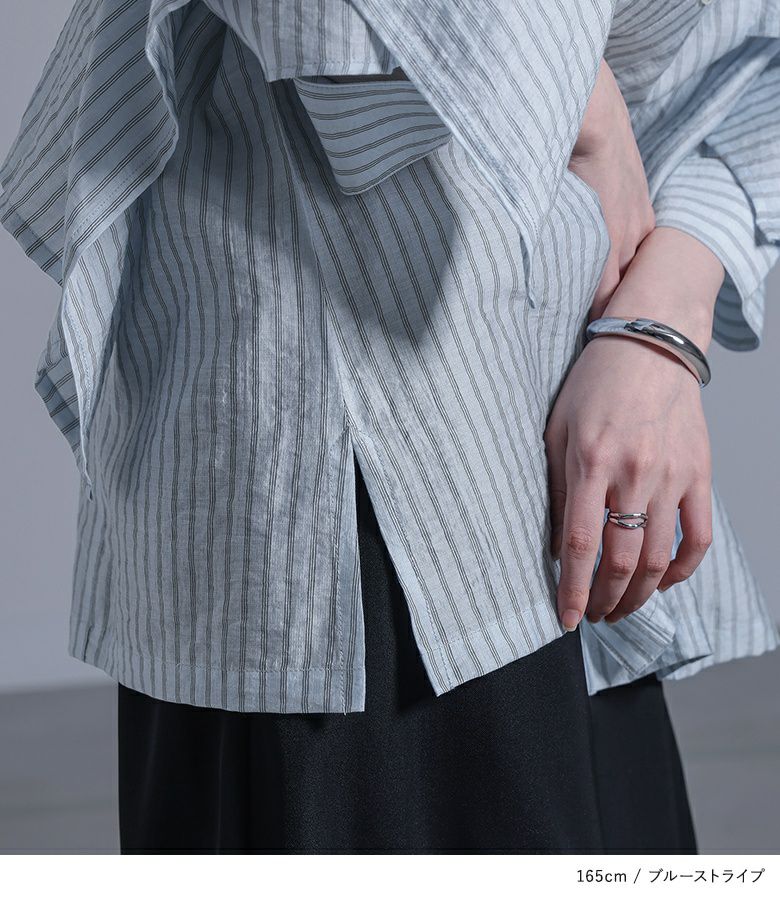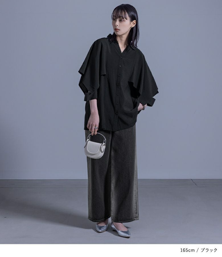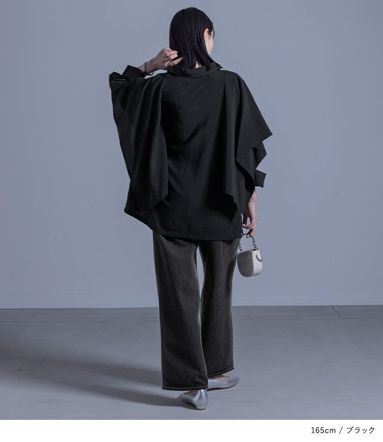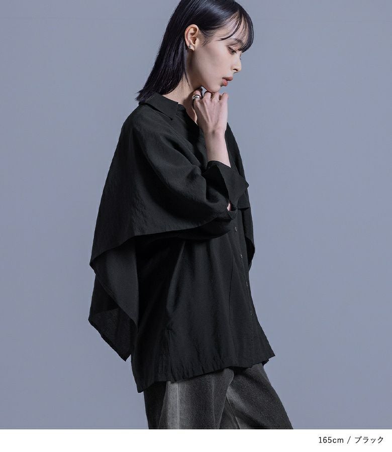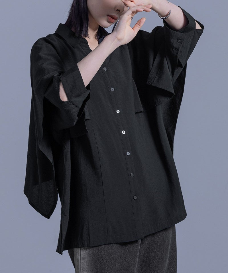 ポンチョのように重ねた袖から見える肌見せデザインが、大人っぽくモードな印象に導く変形シャツ。美しいドレープ感で、360度お洒落に見えるようにこだわりました。スキッパー襟とサイドスリットで抜け感をプラスし、貝調のハトメボタンも価値ありのポイントです。
