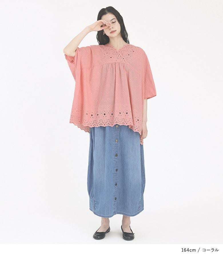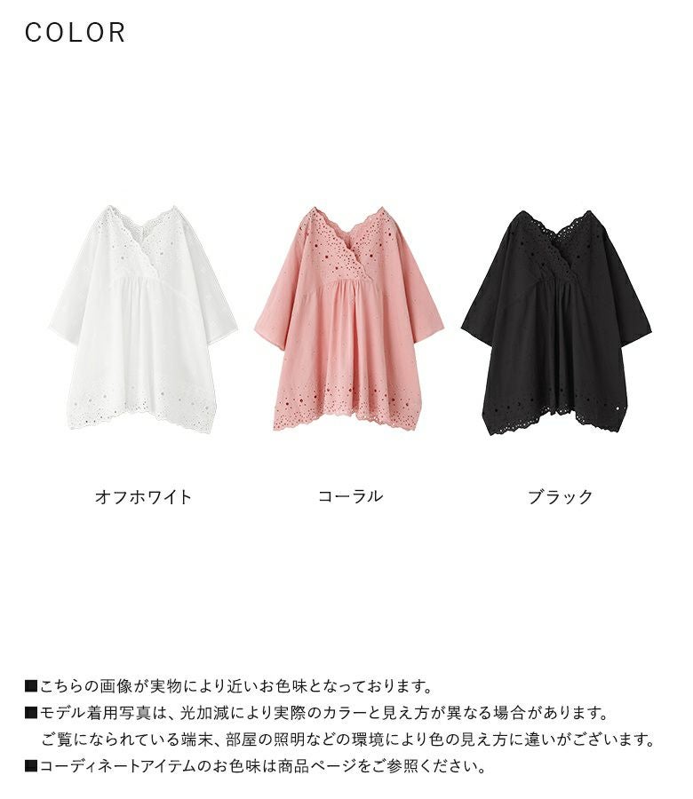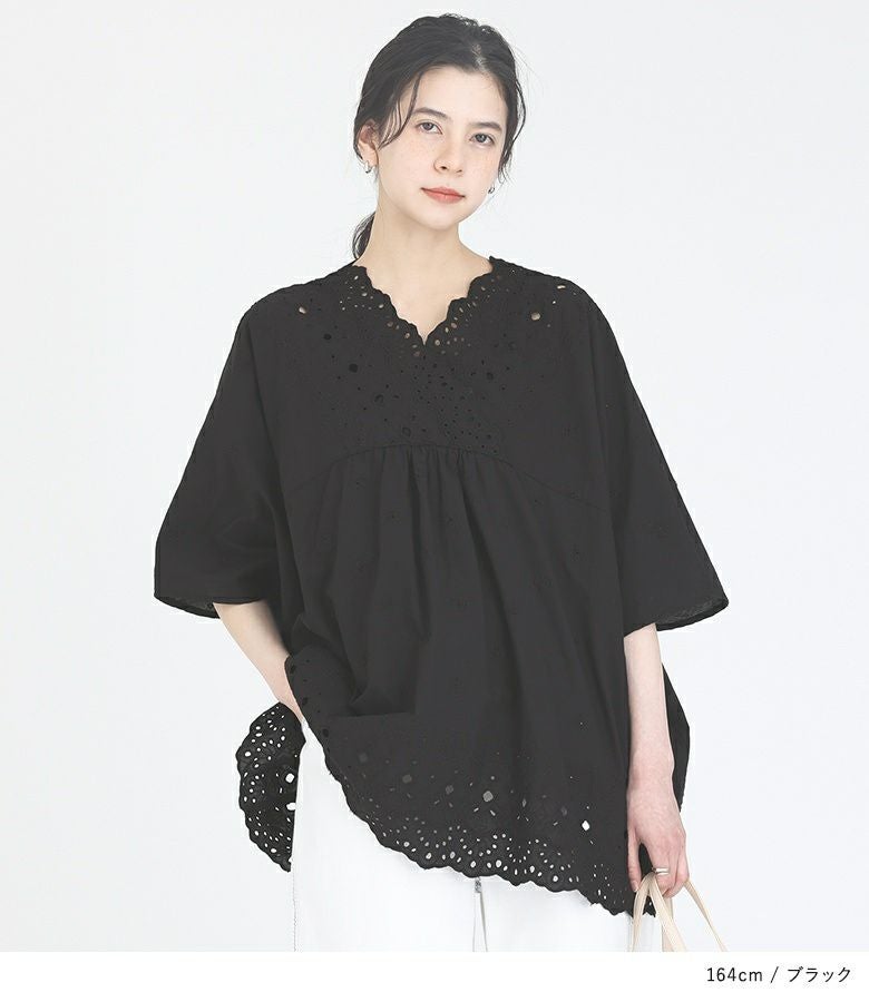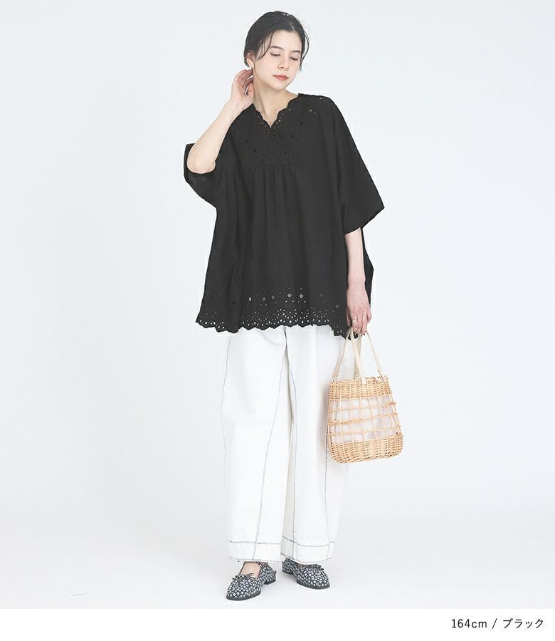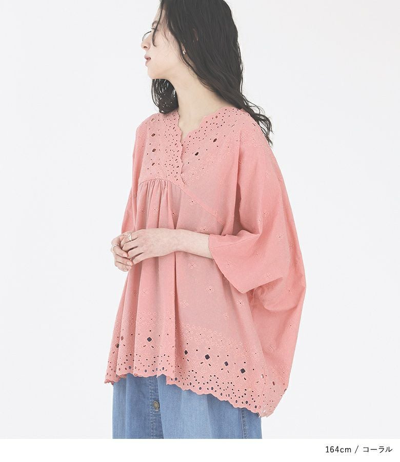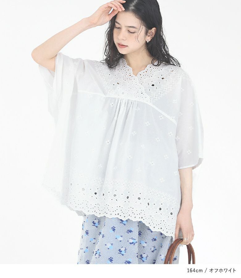 端スカラップの豪華な刺繍柄が目を惹くコットンレースブラウス。アンティークな雰囲気の、透け感ある刺繍が華やかな一枚です。襟元にスカラップ部分がくるようにデザインし、顔周りが華やかになるようにしました。襟元のフロントはカシュクール、バックはVネックにし、可愛くなりすぎずにすっきりとした印象に。横幅をたっぷりとった、脇下がりのゆるっとしたシルエットです。前ヨーク切り替えの中心部にギャザーを入れることで、のっぺりと見えないように工夫しました。