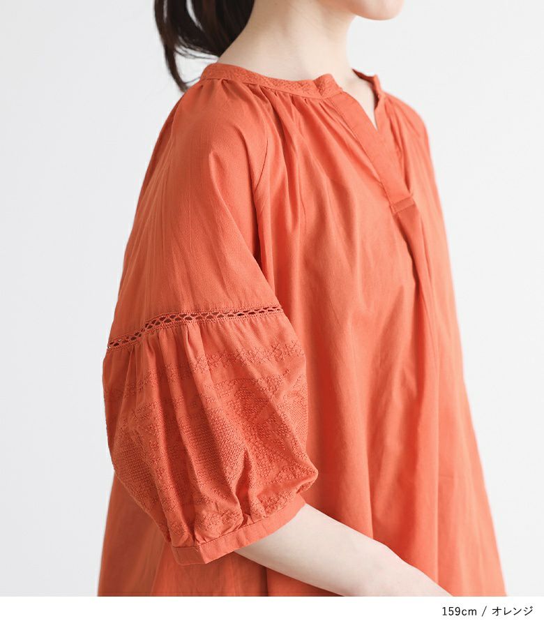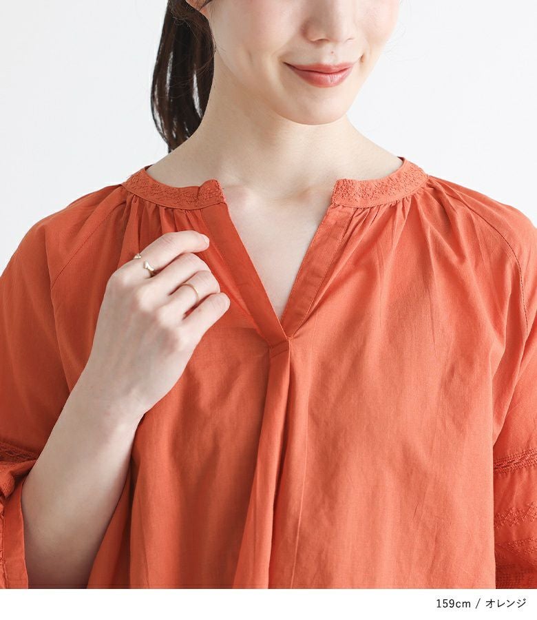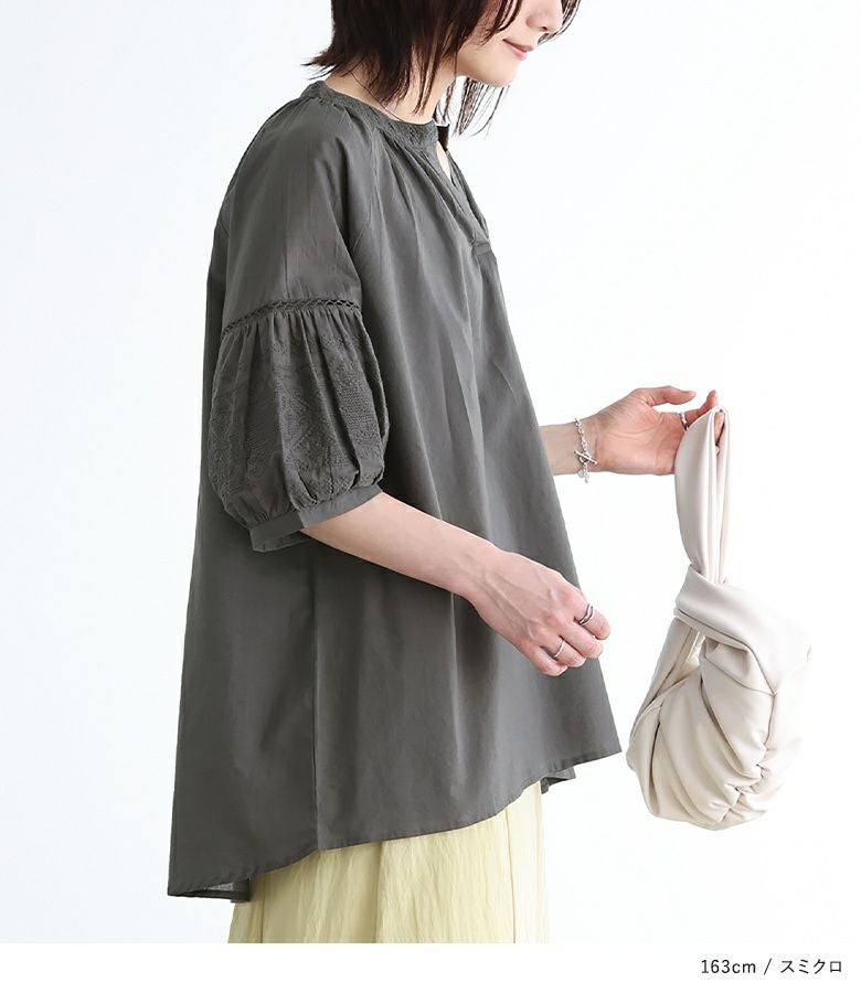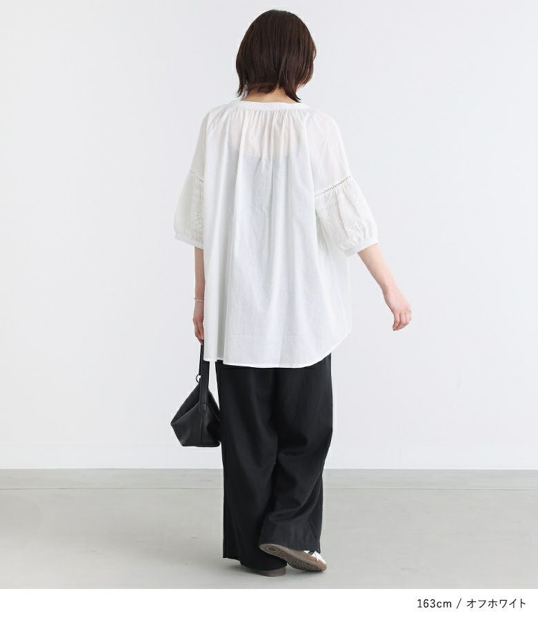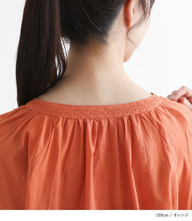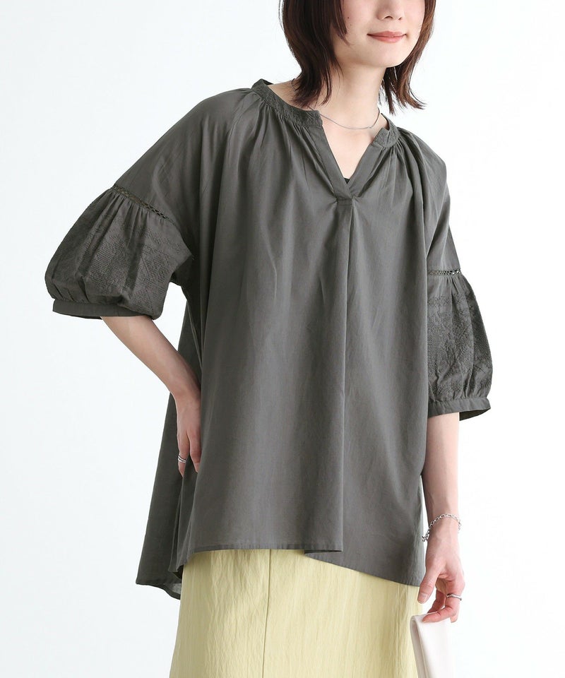 襟ぐりと袖に施した、同色のクロスステッチ刺繍がポイントになったスキッパーブラウス。インド製品ならではの、手の込んだ刺繍デザインをお楽しみください。袖の切り替え部分にはレーステープを使い、透け感が涼し気な印象に。キーネックが抜け感をプラスします。襟ぐり下には程良くギャザーを入れて張り付かず快適に着用できます。